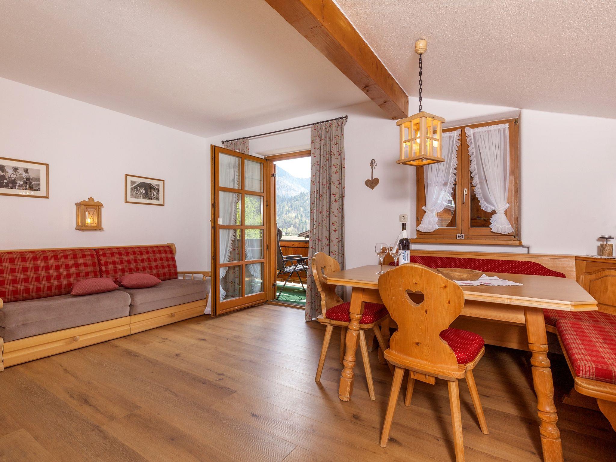 Gemütliche 3-Raum-Wohnung mit Südbalkon im 2. Stock und herllicher Blick auf die Bergwelt von Reit im Winkl. Die Küche ist komplett eingerichtet. Im Wohnzimer. finden Sie eine Schlafmöglichkeit für 1-2 Personen auf der Ausziehcouch.