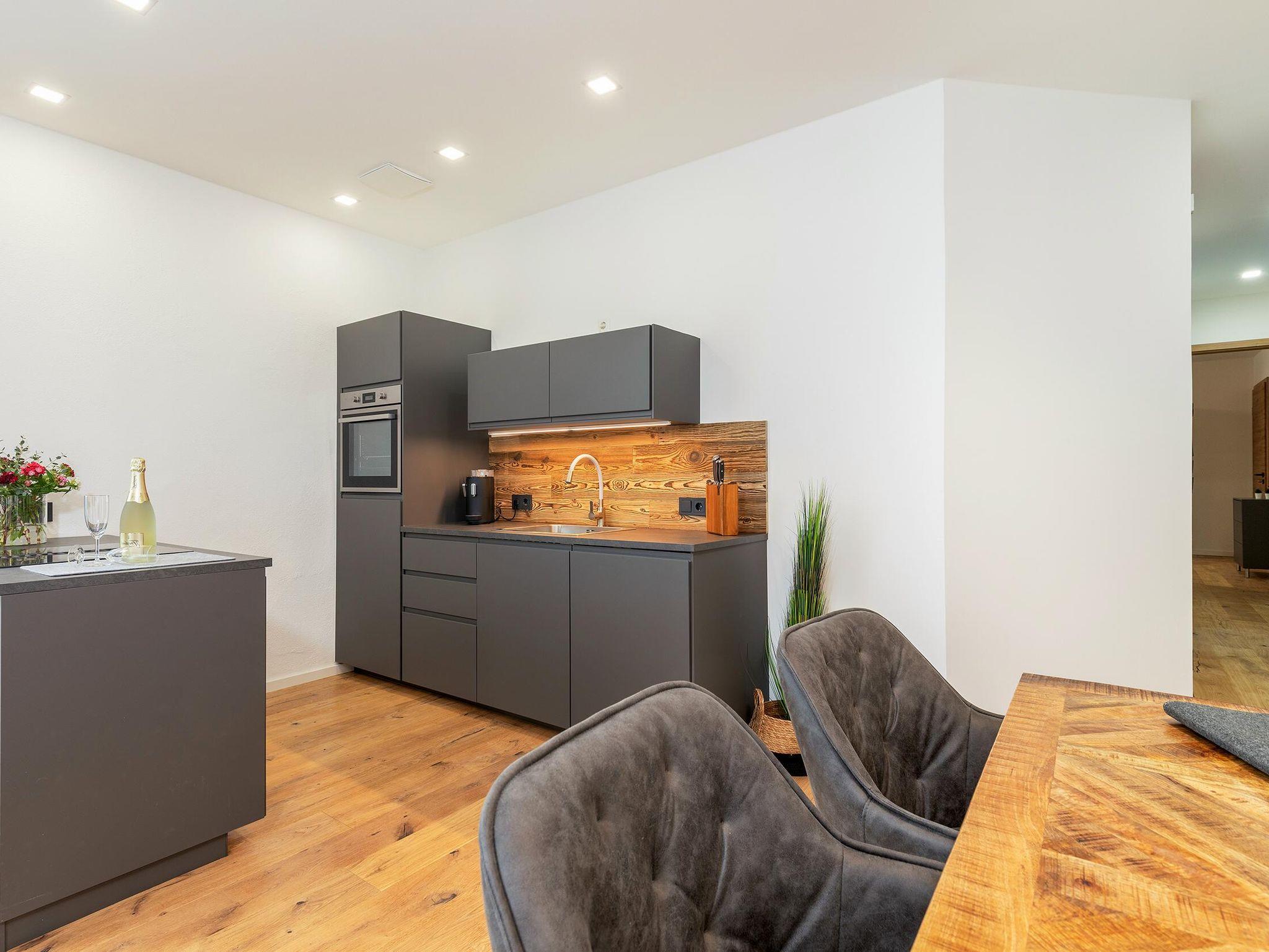 • Designküche mit Induktionskochfeld, separatem Backofen, Geschirrspüler, Mikrowelle, Kühlschrank mit Gefrierfach, Nespressomaschine, Toaster, Wasserkocher und vielem mehr
