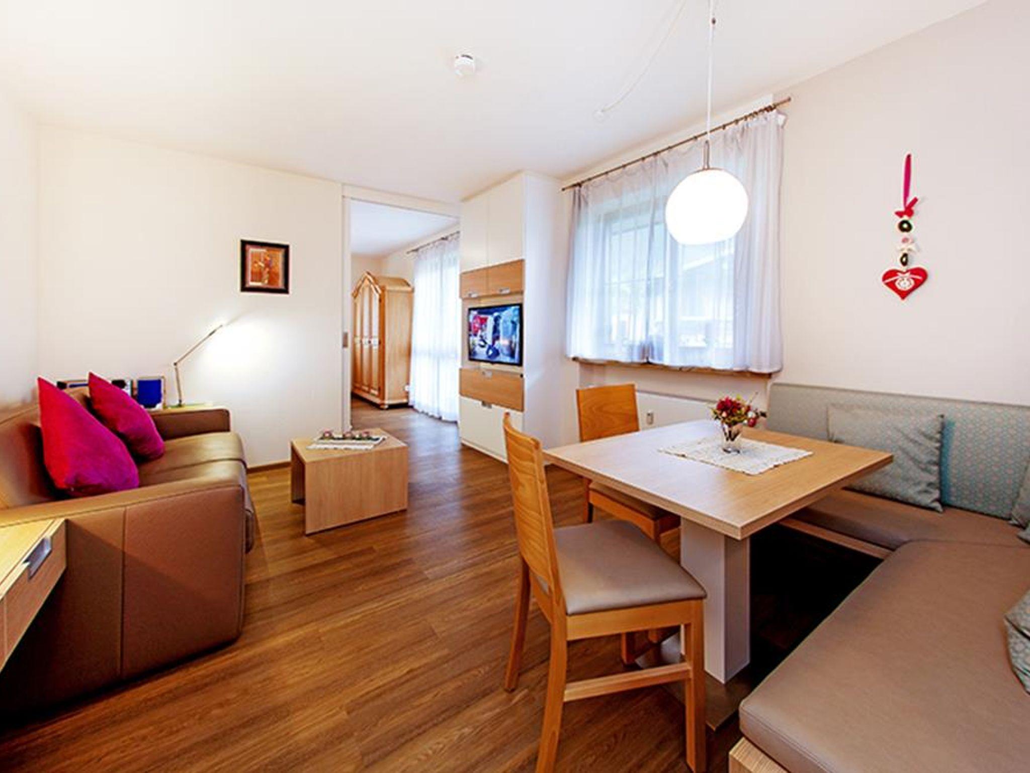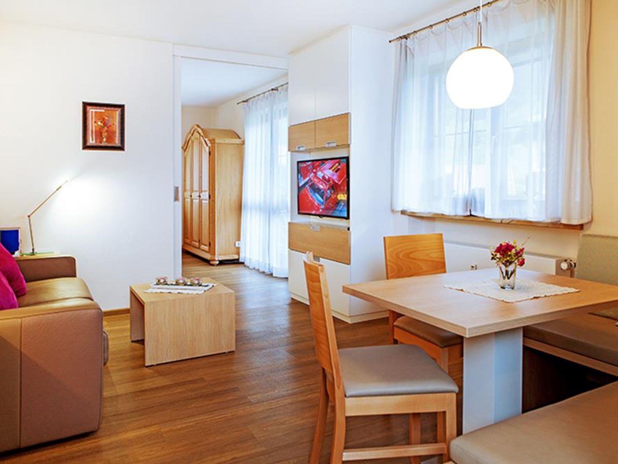 Das Wohnzimmer ist wie der Rest des Apartments in modernem Stil eingerichtet und verfügt über einen Essbereich und ein gemütliches Doppelbett-Schlafsofa. Das separate Schlafzimmer ist mit einem großen Doppelbett und Bauernschrank ausgestattet und durch eine Schiebetür vom Wohnraum getrennt. Die Küchenzeile verfügt über einen Kühlschrank und einen Zwei-Plattenherd und ist komplett ausgestattet. Im renovierten Bad befindet sich ein WC und eine Dusche. Der große möblierte Balkon bietet eine großartige Aussicht auf das wunderschöne Bergpanorama und lädt an sonnigen Tagen zum Verweilen ein. Zudem stehen unseren Gästen Kabel-TV, W-LAN, eine Sauna, ein Aufenthaltsraum und ein Ski-Raum – auch für Fahrräder - zur Verfügung. Haustiere sind hier herzlich willkommen!