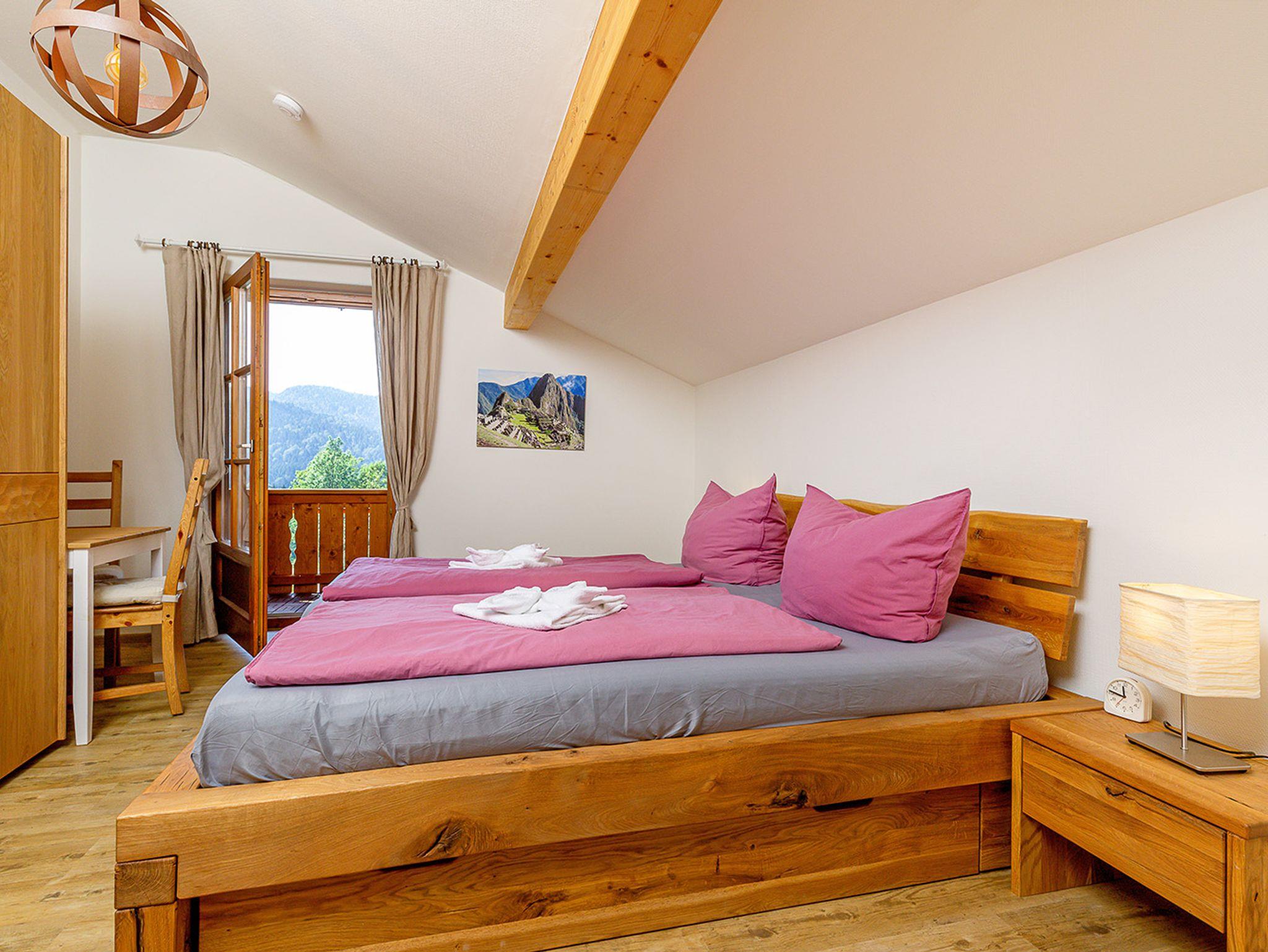 In der unteren Etage befindet sich die Garderobe, das Kinderzimmer, die Waschküche mit Waschmaschine und Trockner, ein sehr modernes Bad mit Dusche und WC. Außerdem ist hier das größte Schlafzimmer mit Zugang zum Garten und eigenem Fernseher und zwei gemütlichen Ausruhsesseln. Ein gepflegtes offenes Treppenhaus führt in die mittlere Etage und trägt zum großzügigen Wohngefühl bei. In der mittleren Etage des dreistöckigen Häusles befindet sich das große und gemütliche Wohnzimmer mit großem Fernseher mit DVD -Player und ein großes Esszimmer. Am massiven Essentisch können alle Gäste gemütlich sitzen. Die putzige Landhausküche ist bestens ausgestattet, so dass die Zubereitung der eigenen Speisen Spaß macht. Durch zwei Kühlschränke mit je einem Eisfach gibt es genug Platz für die Eigenversorgung. Außerdem befindet sich im zweiten Stock noch ein kleines Zimmer mit kleinem Fernseher. Die Doppelausziehcouch dieses Zimmers bietet eine zusätzliche Schlafgelegenheit (Ausweichplatz). Darüber hinaus ist in dieser Etage noch ein kleines Gäste-WC. Aus dem großzügigen Wohnzimmer mit gemütlicher Couch geht es auf den Eckbalkon mit wunderbarem Ausblick in die Natur. Das Bachplätschern und das Vogelgezwitscher sind die einzigen Geräusche, die hier zu hören sind. In der obersten Etage findet sich das größere hochwertige Bad mit übergroßer Dusche, sowie zwei große Schlafzimmer, wobei eines den Zugang zum kuscheligen obersten Giebelbalkon hat. Für Kinder: 2 große Lego -Duplo Kisten, Basketballkorb im Hof und Gesellschaftsspiele, Babyhochstuhl, Kinderbett und Töpfchen vorhanden.