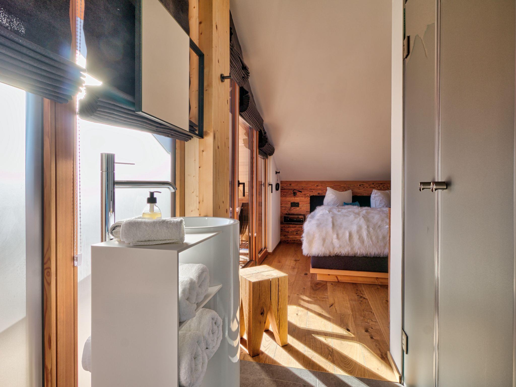 Quasi unter den Sternen nächtigen? Hüttenflair genießen, ohne auf Luxus zu verzichten? Die Gipfelhütte im Dachgeschoß bietet auf 90qm Grundfläche Hüttenflair für 2 bis 7 Personen. Im Masterschlafzimmer mit Doppelbett und eigenem en-suite Bad wirst man quasi von der Sonne wachgeküsst, aus Dusche, Badewanne und Bett den Blick auf die Berge genießen, den Balkon für entspannte private Stunden nutzen. Die zwei “Hüttenzimmer” mit gemeinsamem Bad bieten Platz für jeweils zwei weitere Personen. Aus den gemütlichen Bettenlagern heraus durch die großen Dachflächenfenster die Sterne beobachten, sich gerne an die kuschelige Zeit in Berghütten erinnern.