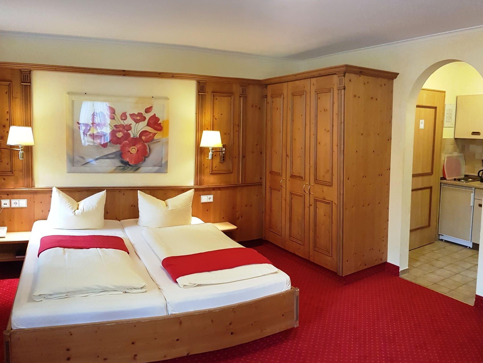 Wohn/Schlafraum, Doppelbett, Couch, Essecke, komplett eingerichtete Kochnische, 2-Platten-Herd, Mikrowelle, Kühlschrank/Tiefkühlfach, Dusche-/Badewanne/WC, Föhn, Balkon/Terrasse, Zimmersafe, Telefon, SAT-TV, kostenloses W-Lan, Radiowecker