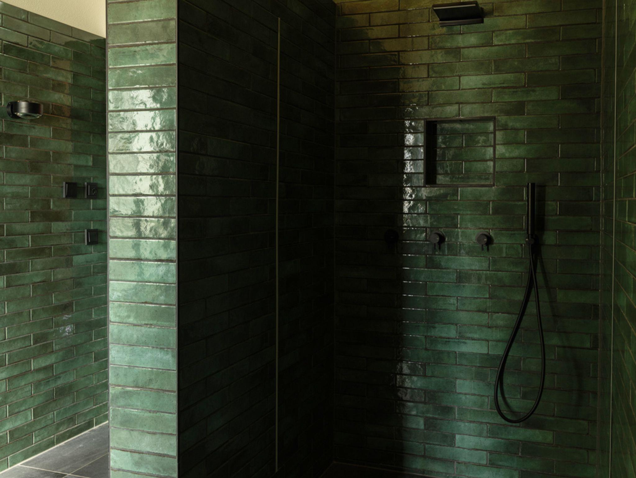 Offenes Bad mit ebenerdiger Regendusche und Waschtisch