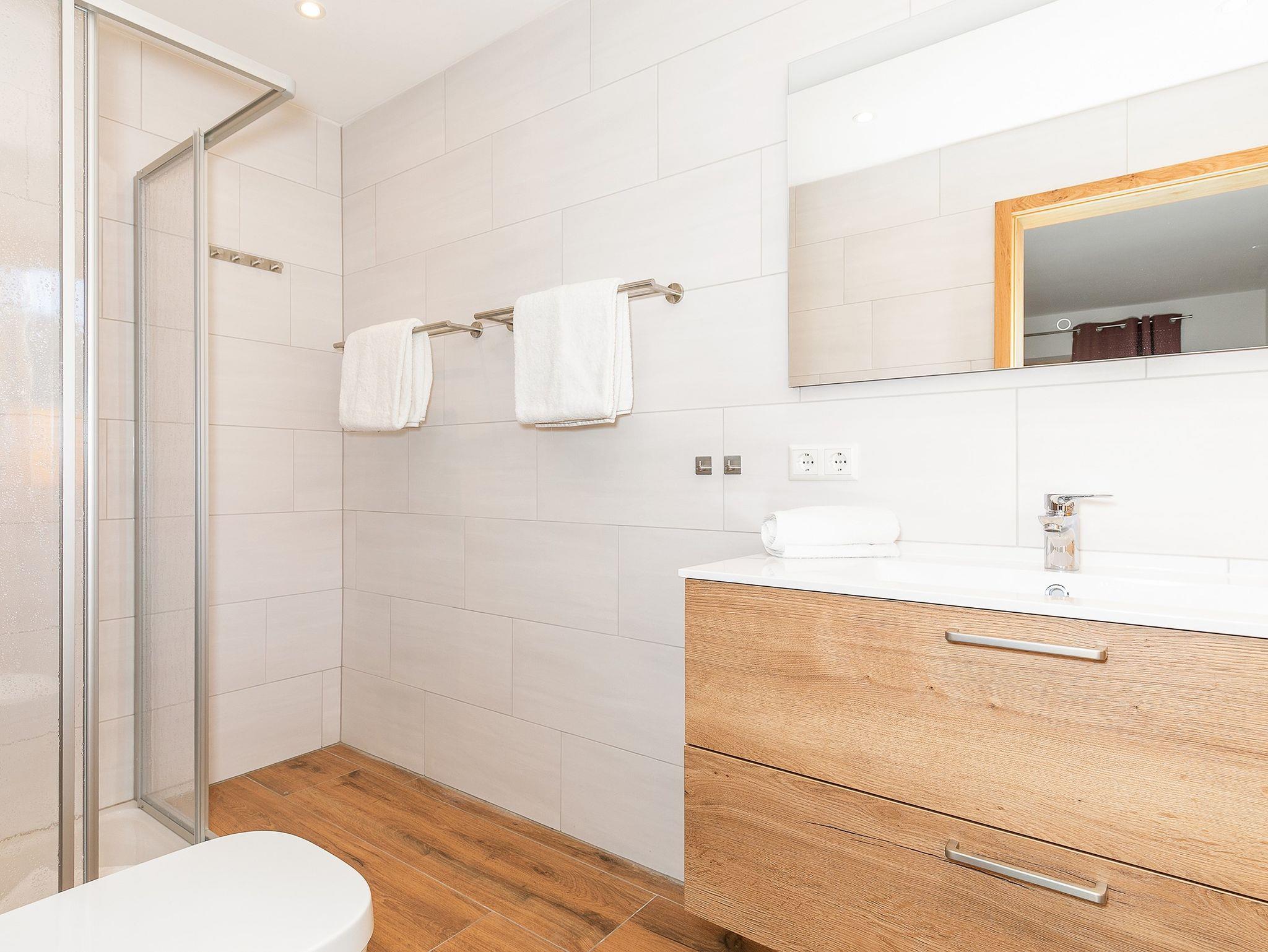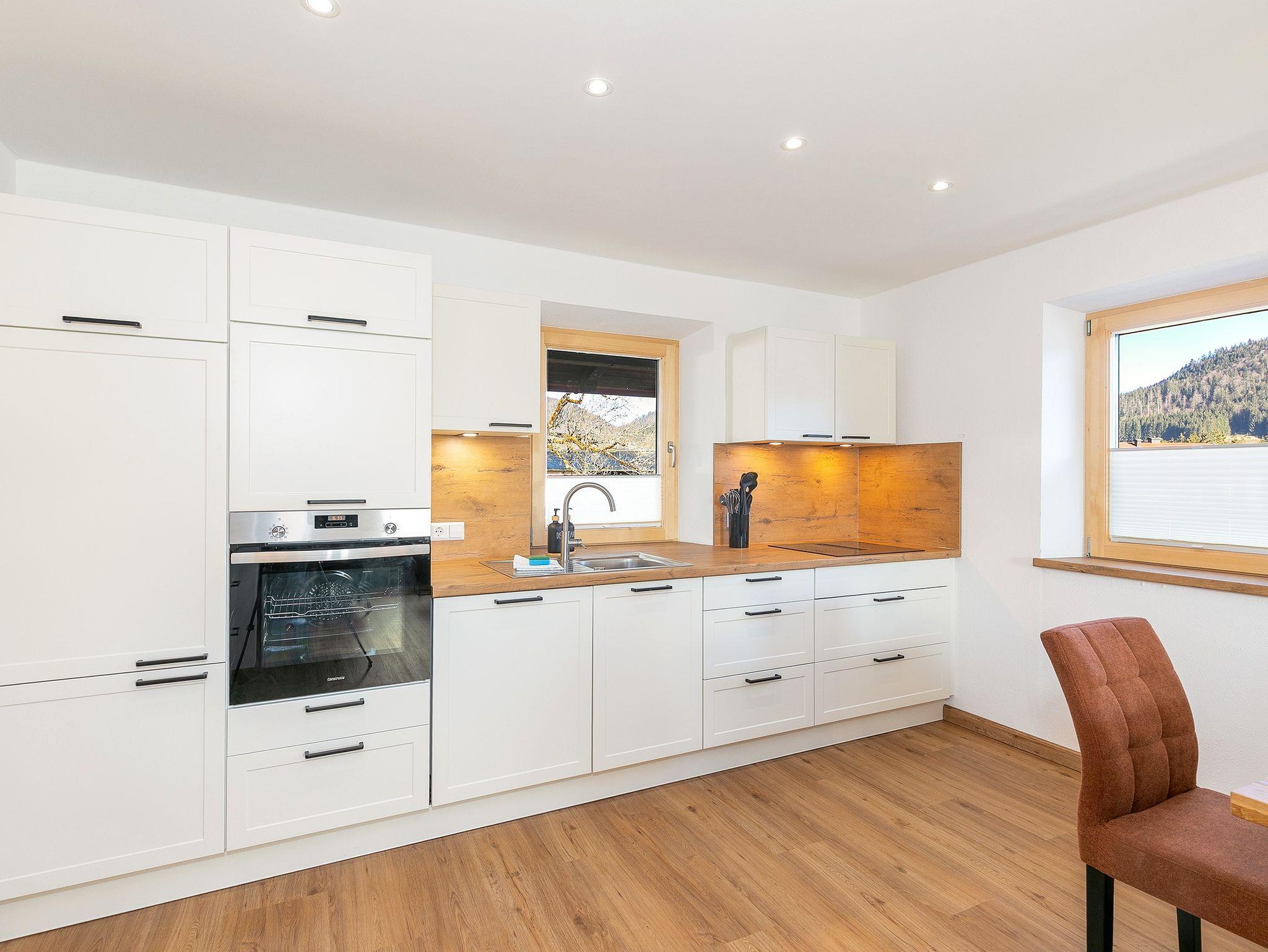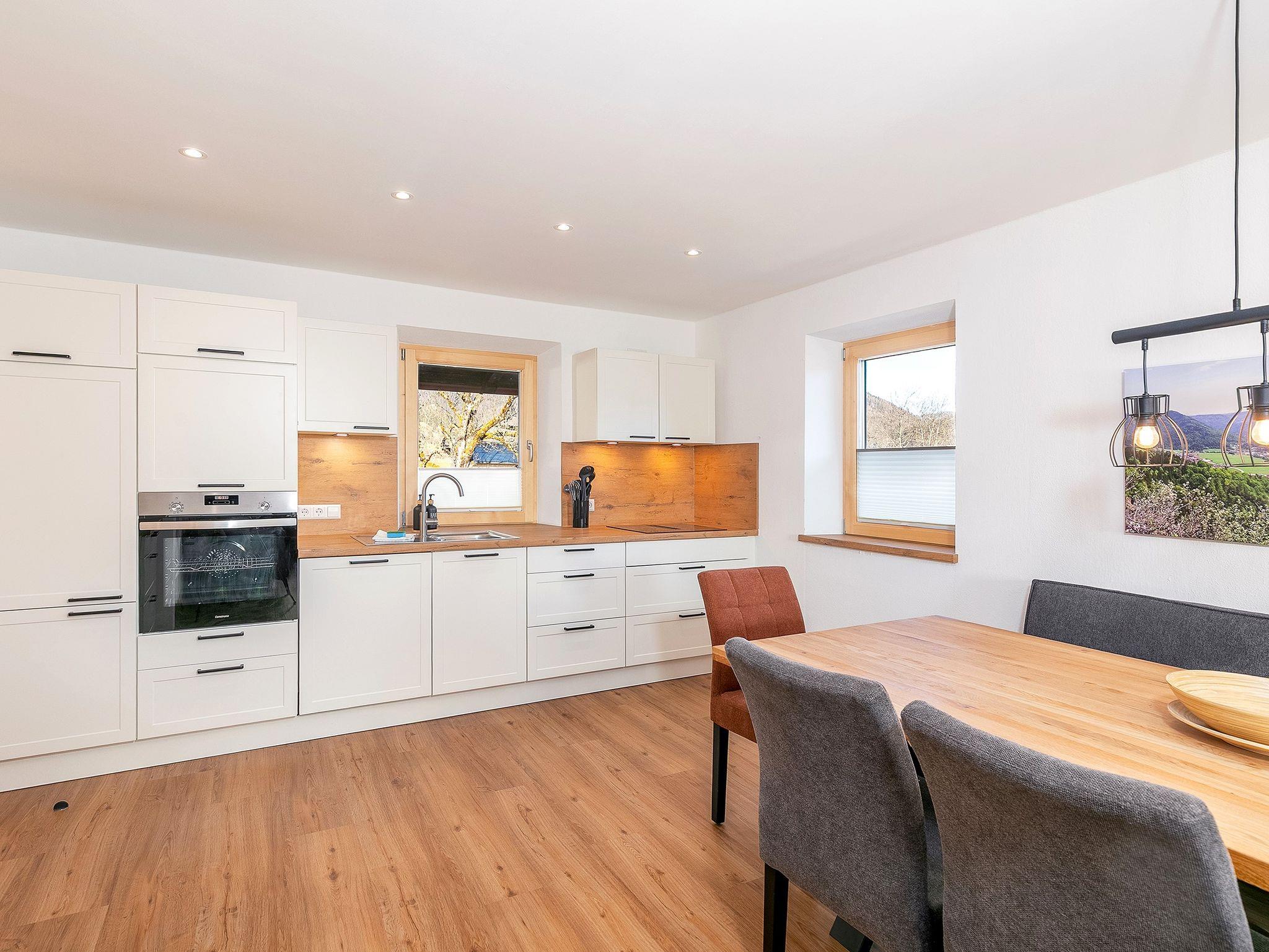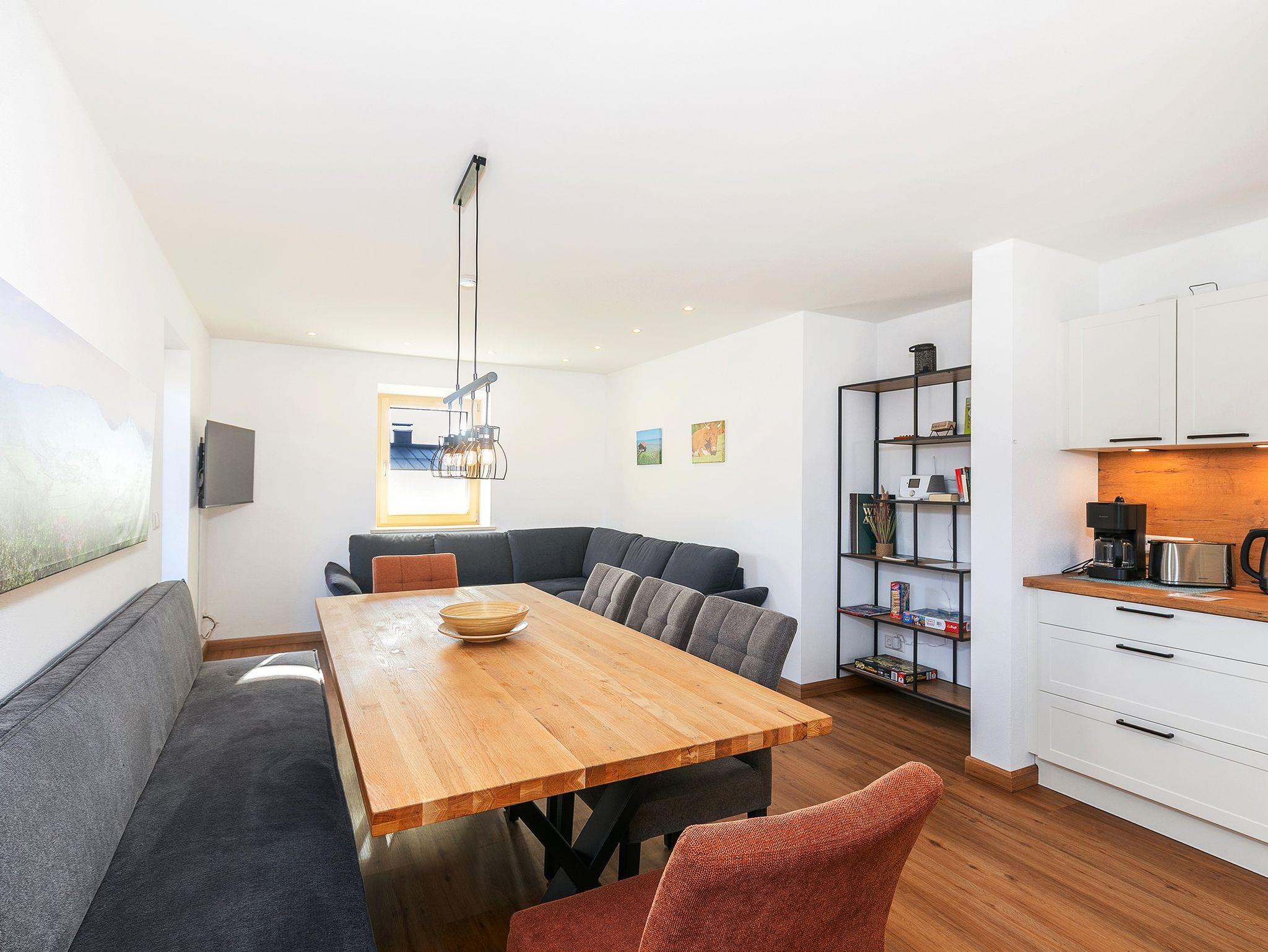 Die Küche ist ein wahres Highlight – voll ausgestattet mit hochwertigen Geräten, darunter ein Induktionsherd und ein Waschtrockner. Durch die vielen Fenster in der Wohnung strömt das natürliche Licht, was eine besonders einladende und warme Atmosphäre schafft. WLAN und ein Smart-TV sorgen für zusätzlichen Komfort, während Sie sich nach einem aktiven Tag in den Bergen entspannen können. Für Ihre Fahrräder oder Skier gibt es praktische Abstellmöglichkeiten.