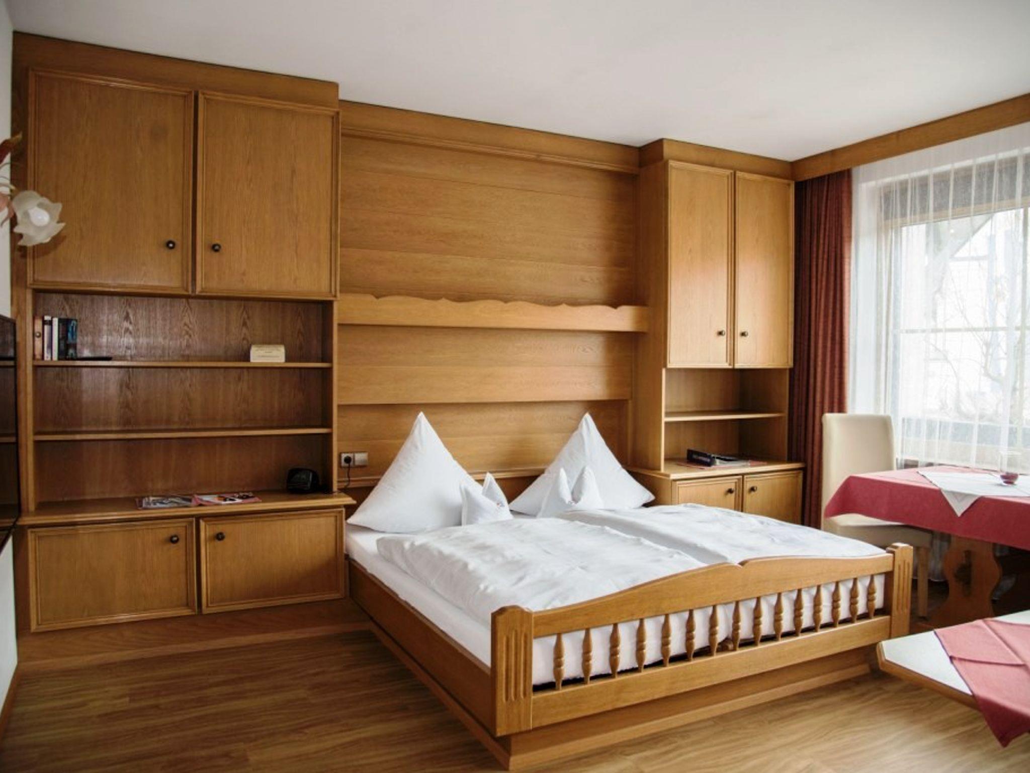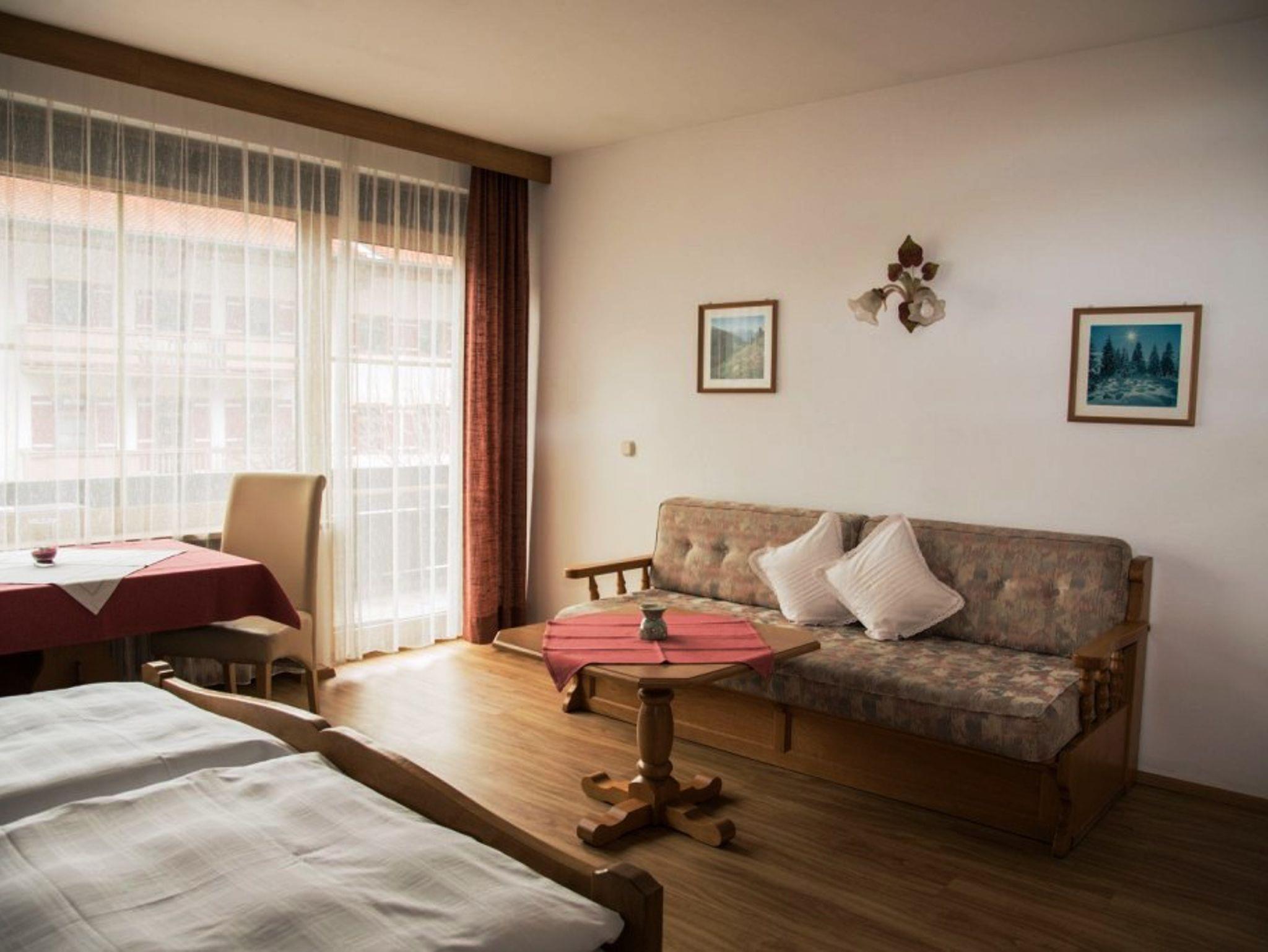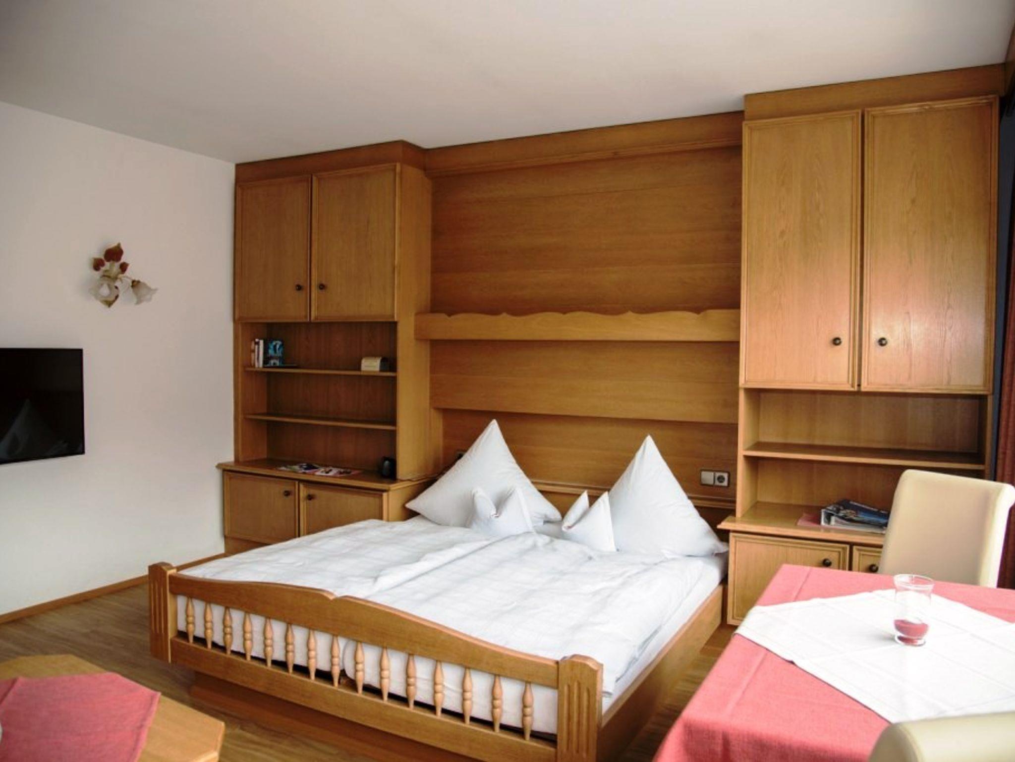 Großer Wohn-Schlafraum mit Doppelbett, gemütlicher Sitz- und Essecke, Zimmersafe. Separate Küche und Dusche/WC. Vom Ostbalkon haben Sie den Blick zur Kirche/Hausberg mit Morgensonne.