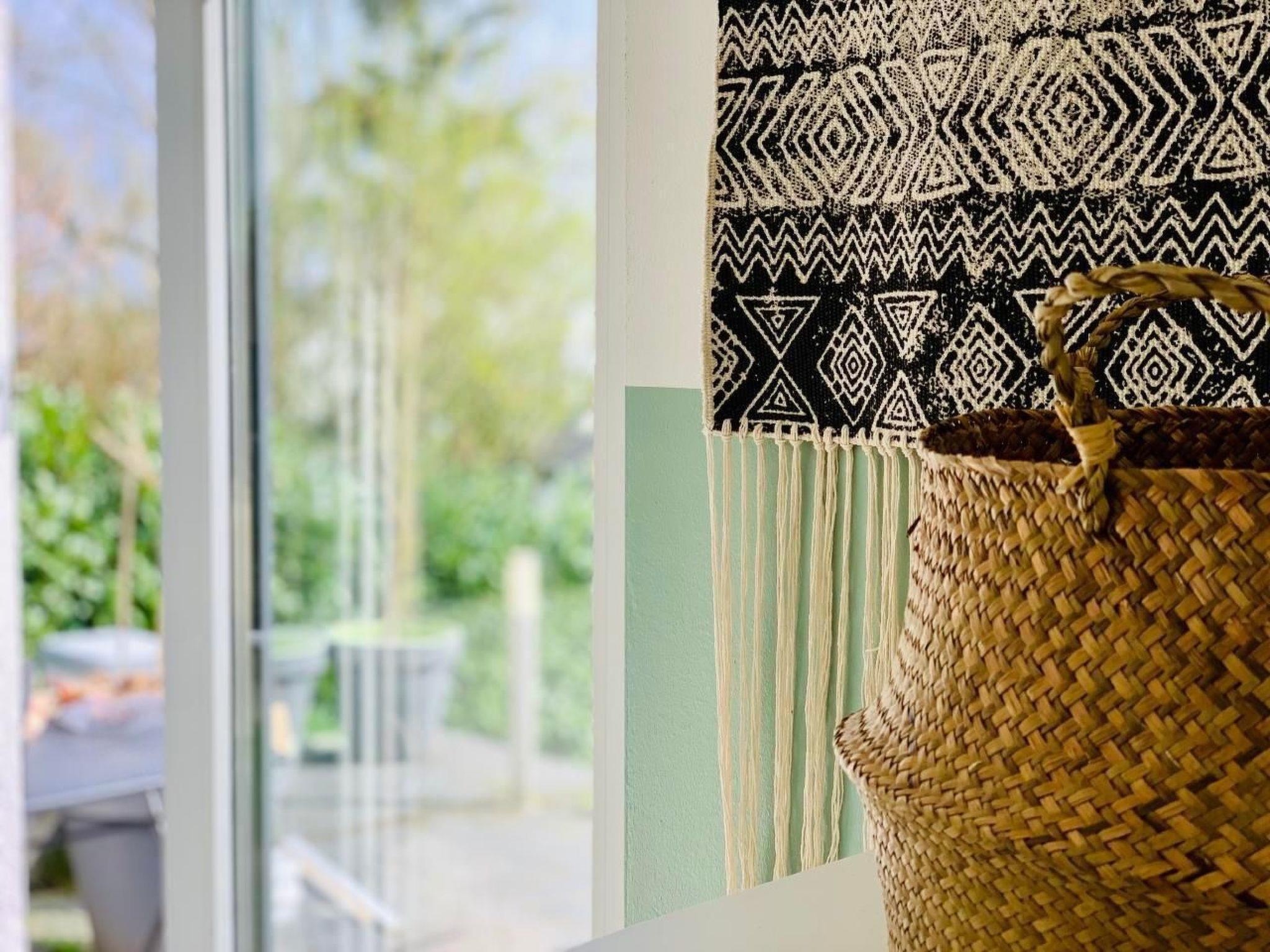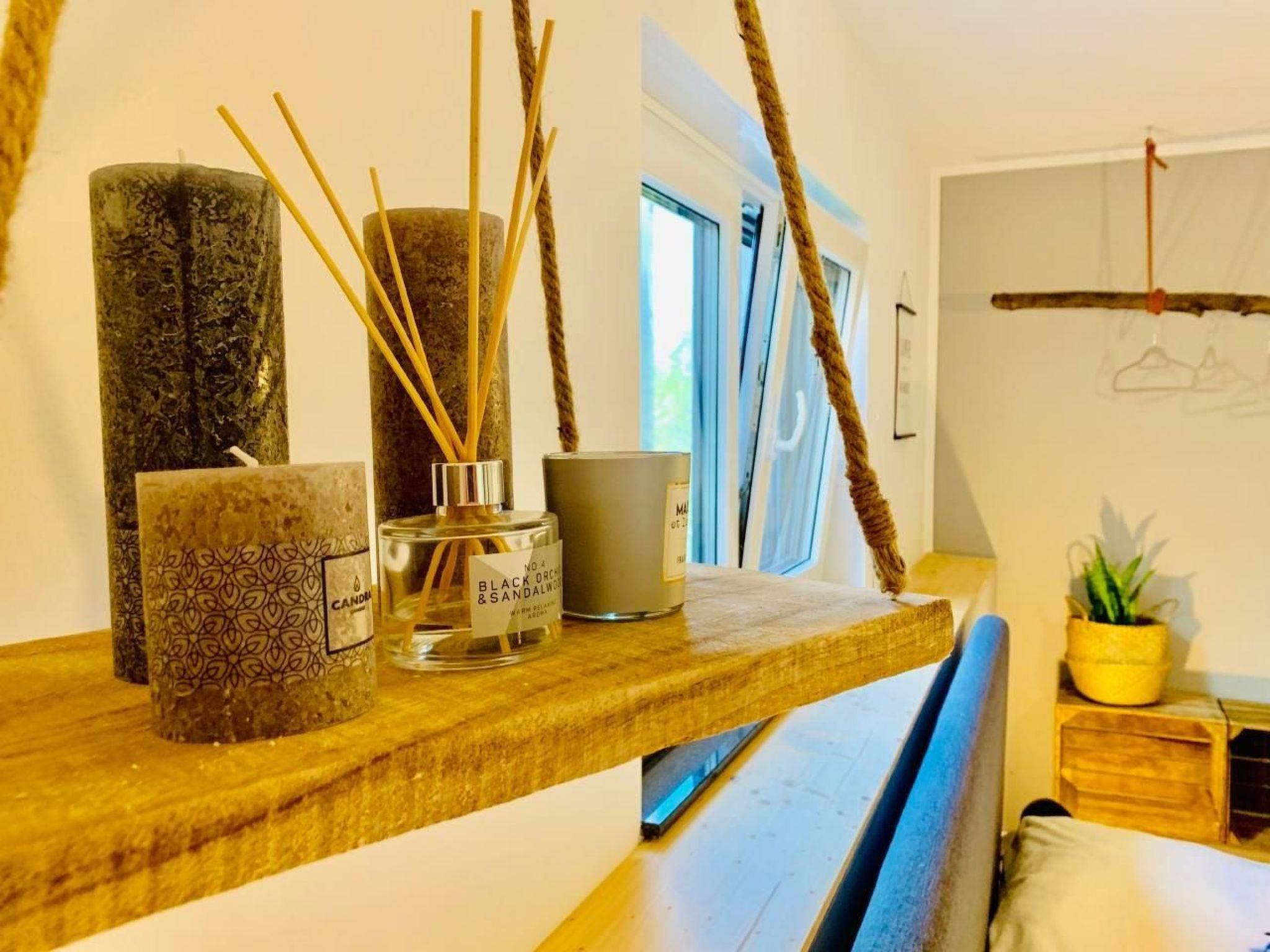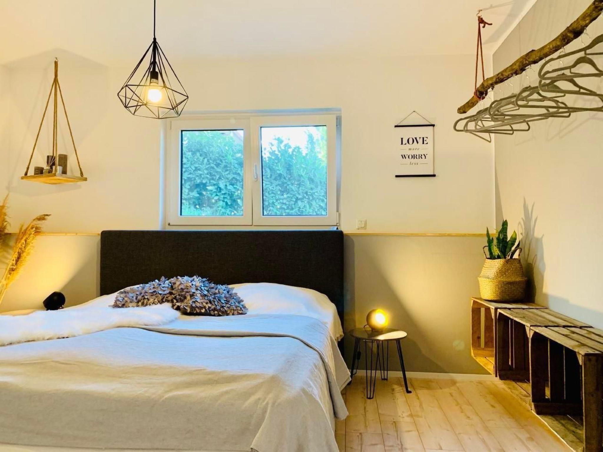 Inside, you will find a lovingly furnished living area that leaves nothing to be desired. The spacious living room has a comfortable sofa set, a practical writing corner and a 42-inch flat-screen TV equipped with Astra and Amazon Fire Stick, ideal for relaxing evenings. The high-quality sofa bed with a 22 cm thick hard foam mattress promises restful sleep for up to two guests. In the bedroom you will find an inviting king-size box-spring bed, suitable for two people, as well as enough space for an additional cot. A wardrobe and three chest cupboards offer plenty of storage space.