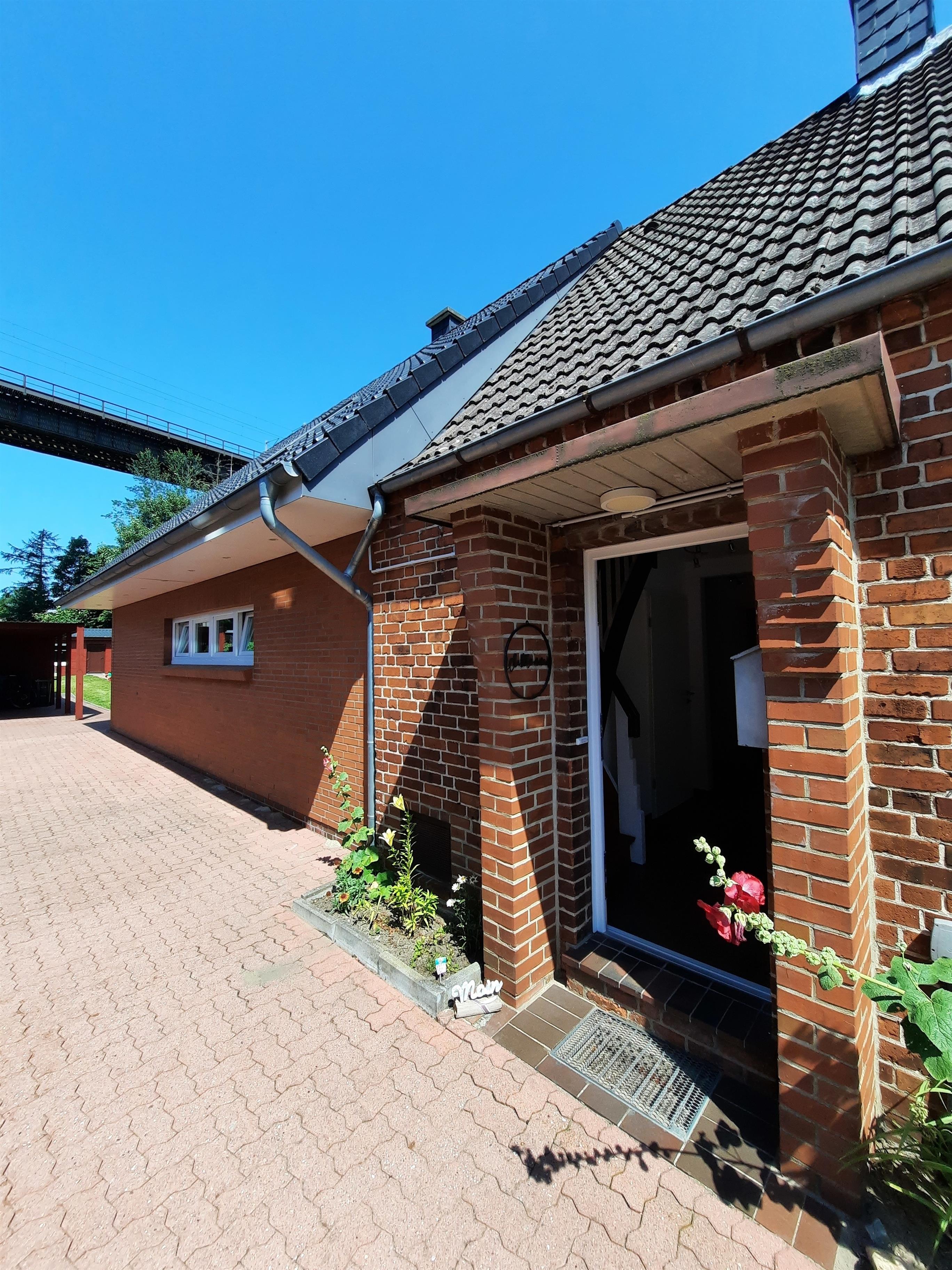 Die Lage des Hauses ist ideal für Gäste, die Rendsburg und die Umgebung zu Fuß oder mit dem Fahrrad erkunden möchten. In nur zehn Gehminuten erreicht man das Stadtzentrum mit Theater, Kino, Museen, Kirchen, Restaurants, Apotheken, Ärzten, Einkaufsmöglichkeiten sowie den Bahnhof und den zentralen Busbahnhof. Von der Terrasse des Ferienhauses bietet sich ein beeindruckender Blick auf die Rendsburger Eisenbahnhochbrücke, eines der bedeutendsten Bauwerke der Stadt. Auch der Nord-Ostsee-Kanal ist in wenigen Minuten erreichbar und lädt zu ausgedehnten Spaziergängen oder Radtouren entlang der Wasserstraße ein. Der Kanal ist ein beliebtes Ziel für Besucher, die Schiffe aus nächster Nähe beobachten oder eine Schifffahrt unternehmen möchten.