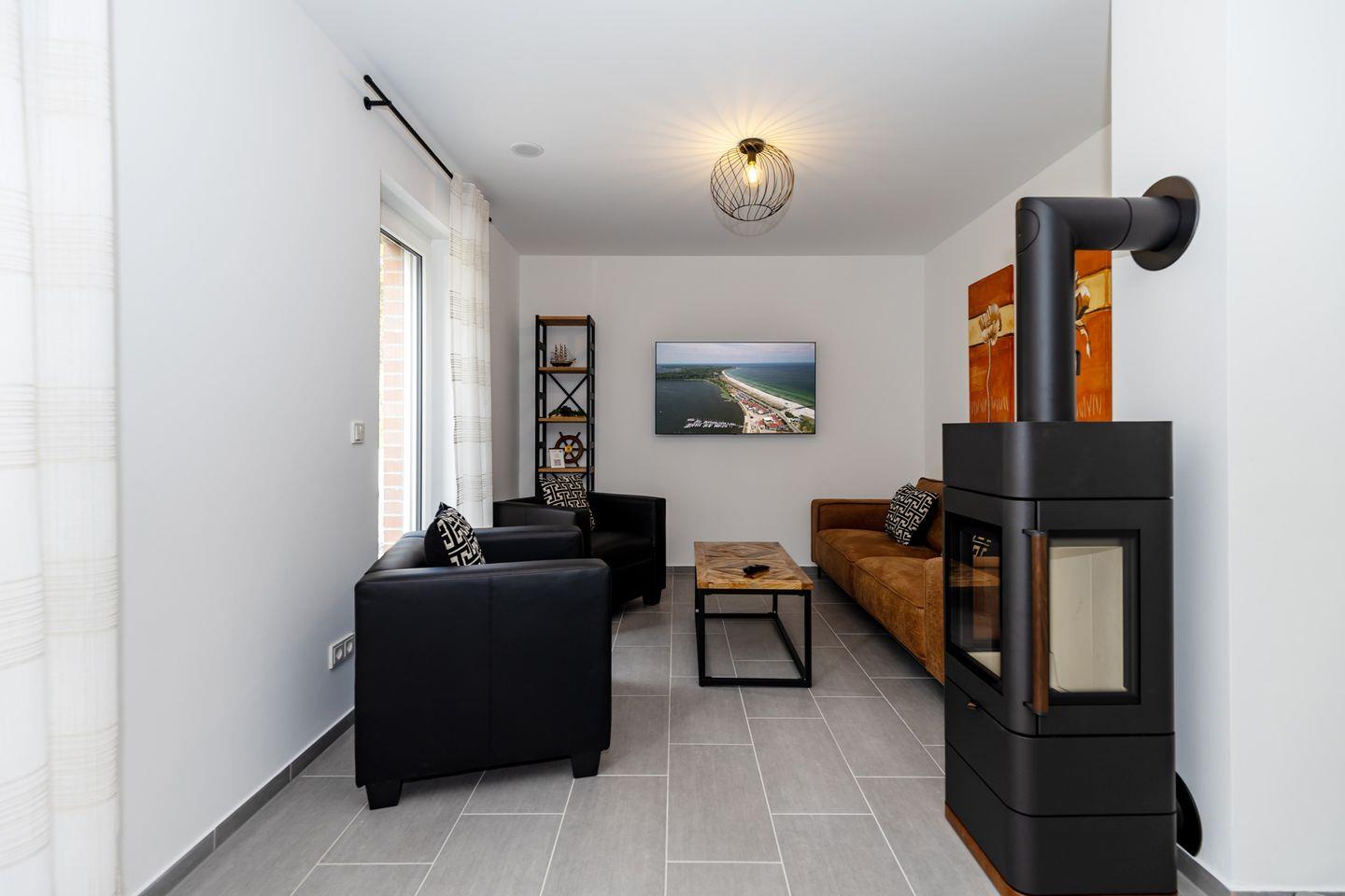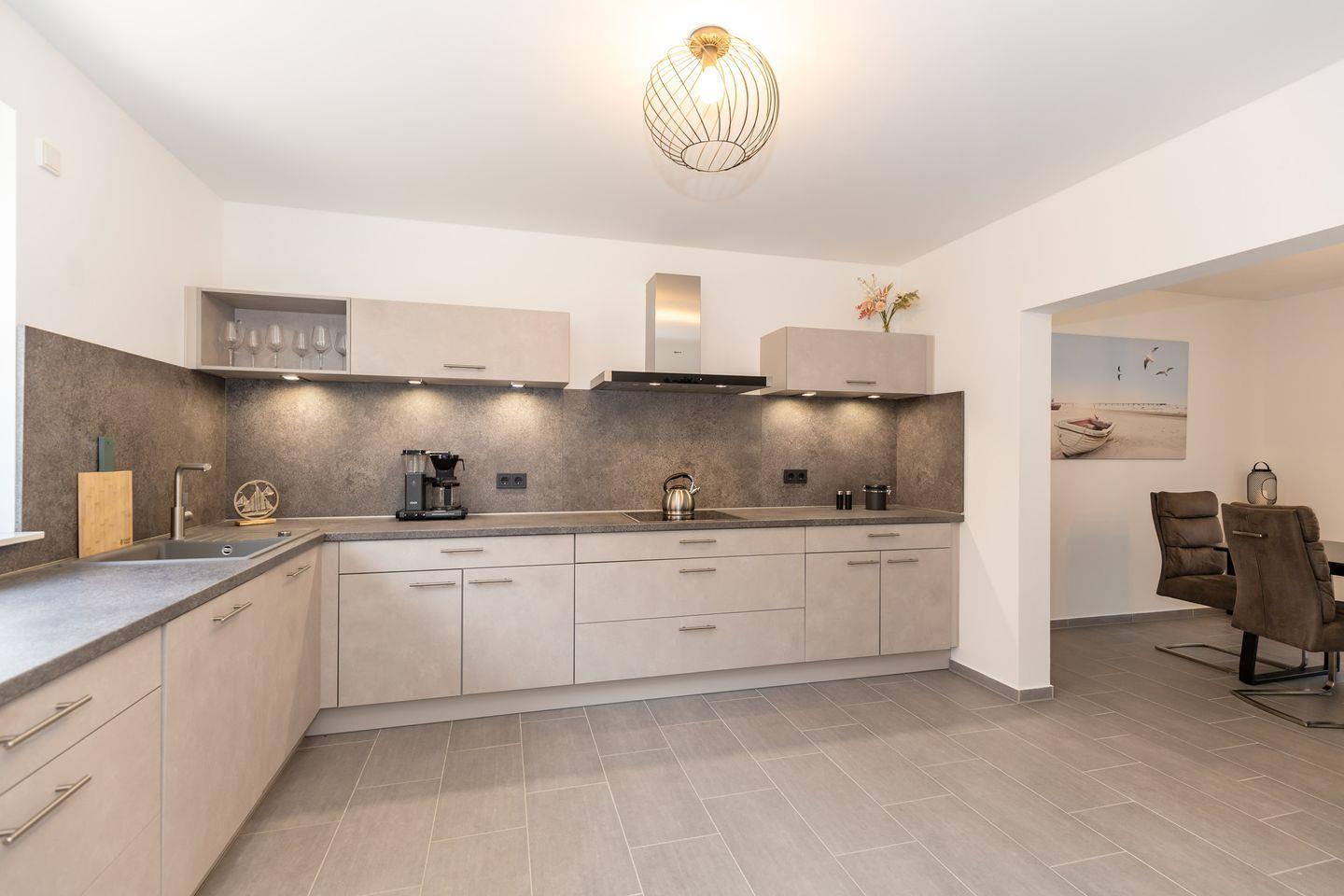Mit einer Wohnfläche von 117 Quadratmetern bietet das Ferienhaus "Stangenberg Bucht" ausreichend Platz für bis zu sechs Personen. Beim Betreten des Hauses werden Sie von einem einladenden Wohnzimmer begrüßt, das mit einem bequemen Sofa und einem Flachbildfernseher ausgestattet ist, perfekt für gemütliche Abende mit der Familie oder Freunden. Die angrenzende Küche ist modern und voll ausgestattet mit allen Annehmlichkeiten, die Sie benötigen, um köstliche Mahlzeiten zuzubereiten. Der Essbereich bietet Platz für alle Gäste und lädt zu geselligen Mahlzeiten ein.