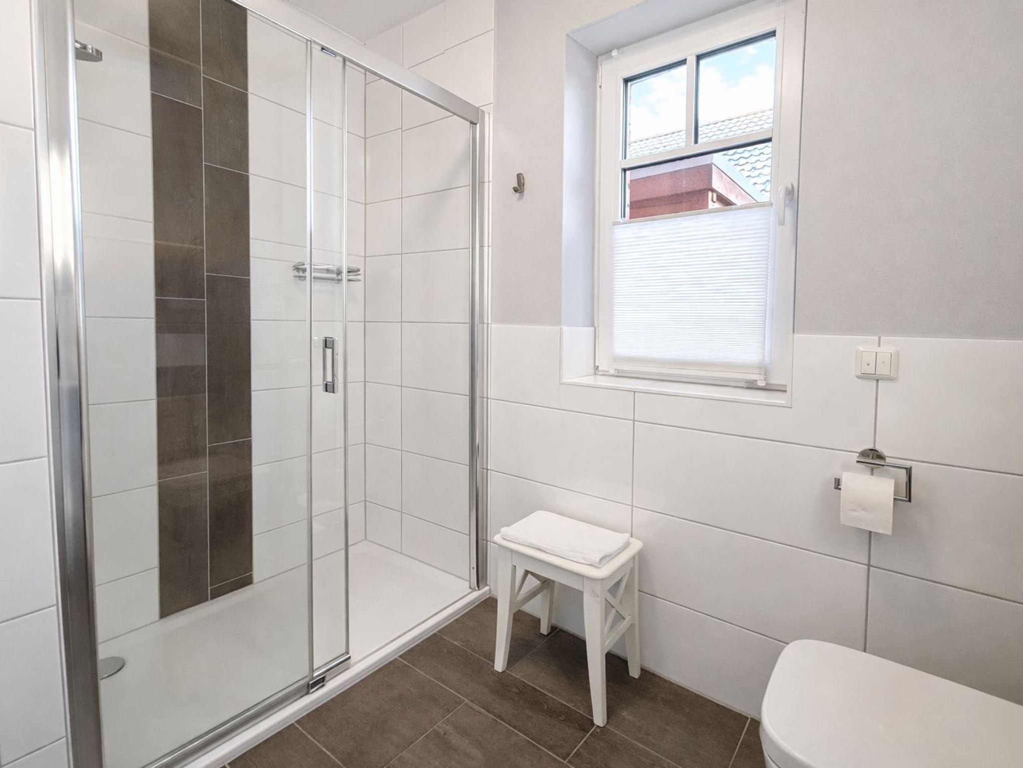 Obergeschoss: 1 Schlafraum mit Doppelbett, 1 Schlafraum mit zwei Einzelbetten (auch zusammenstellbar), Bad/WC mit Badewanne.