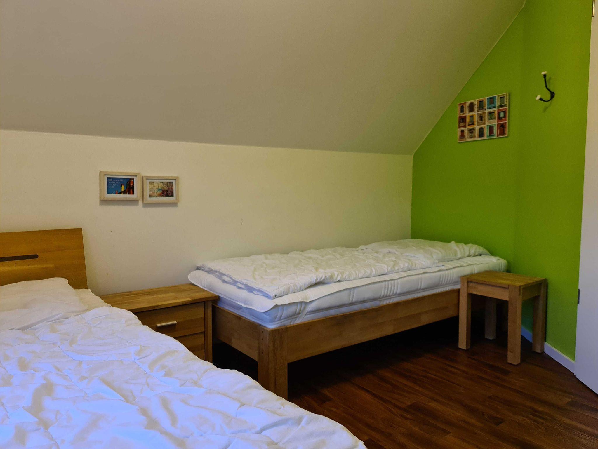 2 Schlafräume: Schlafraum Nr. 1 mit Doppelbett (1,80 x 2 m mit getrennten Matratzen, verstellbare Lattenroste), Schlafraum Nr. 2 mit zwei Einzelbetten (auch zusammenstellbar), Bad mit Badewanne und WC.