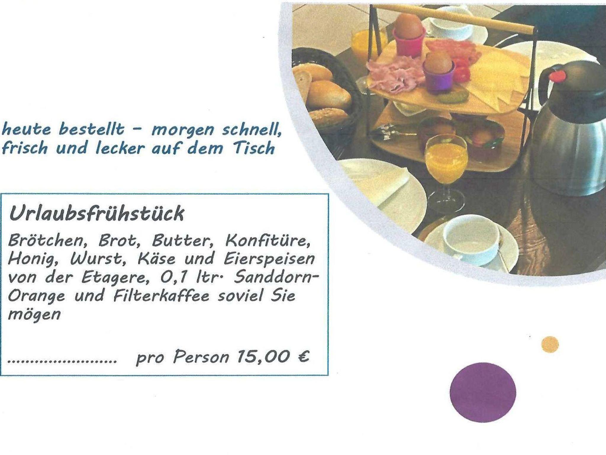 • Service auf Wunsch (Gebühr): 2. Hochstuhl, 2. Babybett (Komplettset inkl. Bettwäsche und Matratze) nach Verfügbarkeit, Brötchenservice und Fahrradlieferservice. Bettwäsche & Handtücher mietbar oder bitte selbst mitbringen