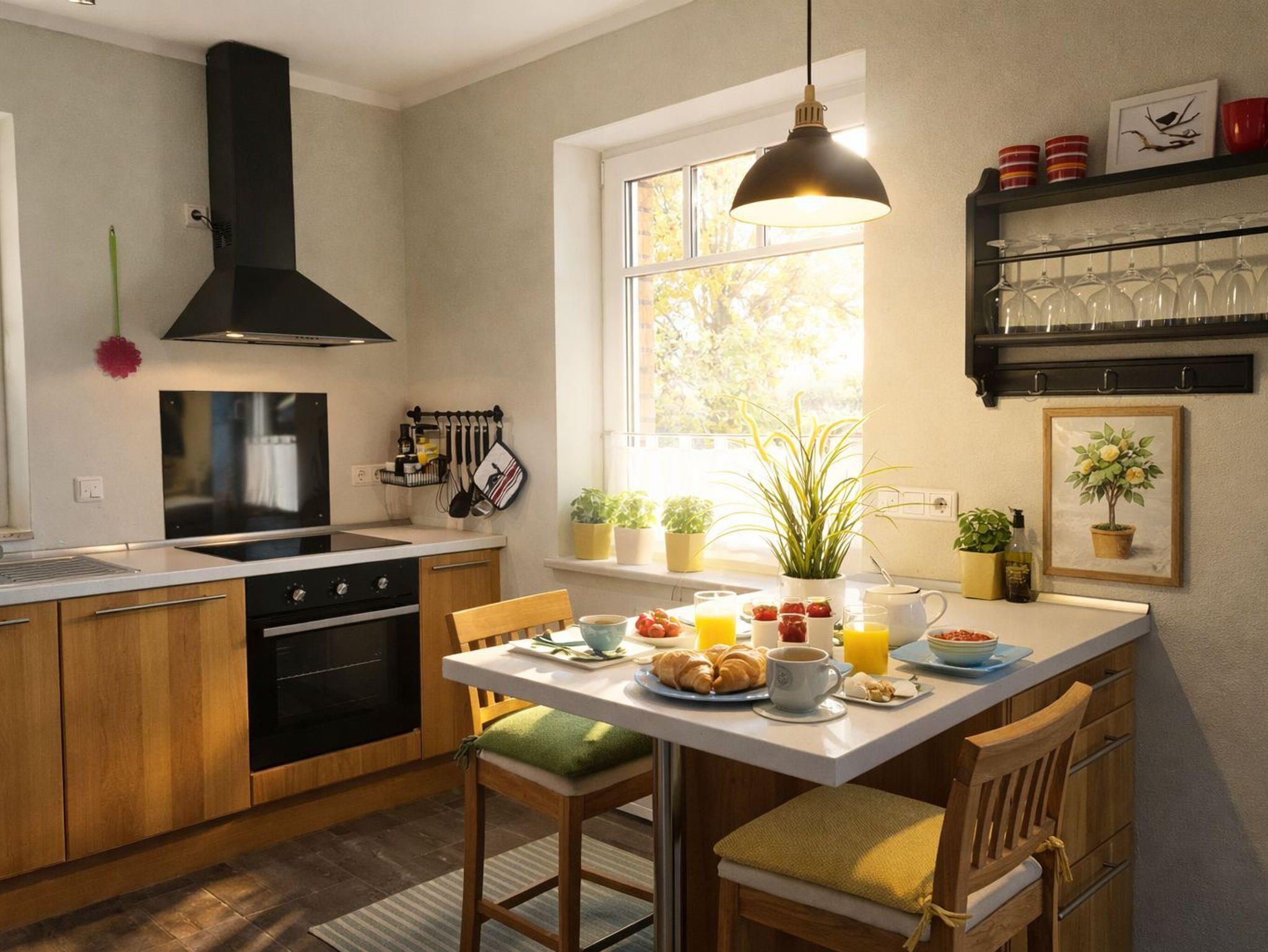 Wohnraum mit Kamin, Esstisch, offene Küche (Mikrowelle, Geschirrspüler, 4-Platten-Herd, Backofen) sowie Terrassenzugang. Ebenfalls im EG befindet sich ein Duschbad/ WC und Waschmaschine (kostenlos). Im Wohnbereich ist die Couch als Schlafgelegenheit für 1 Person nutzbar.