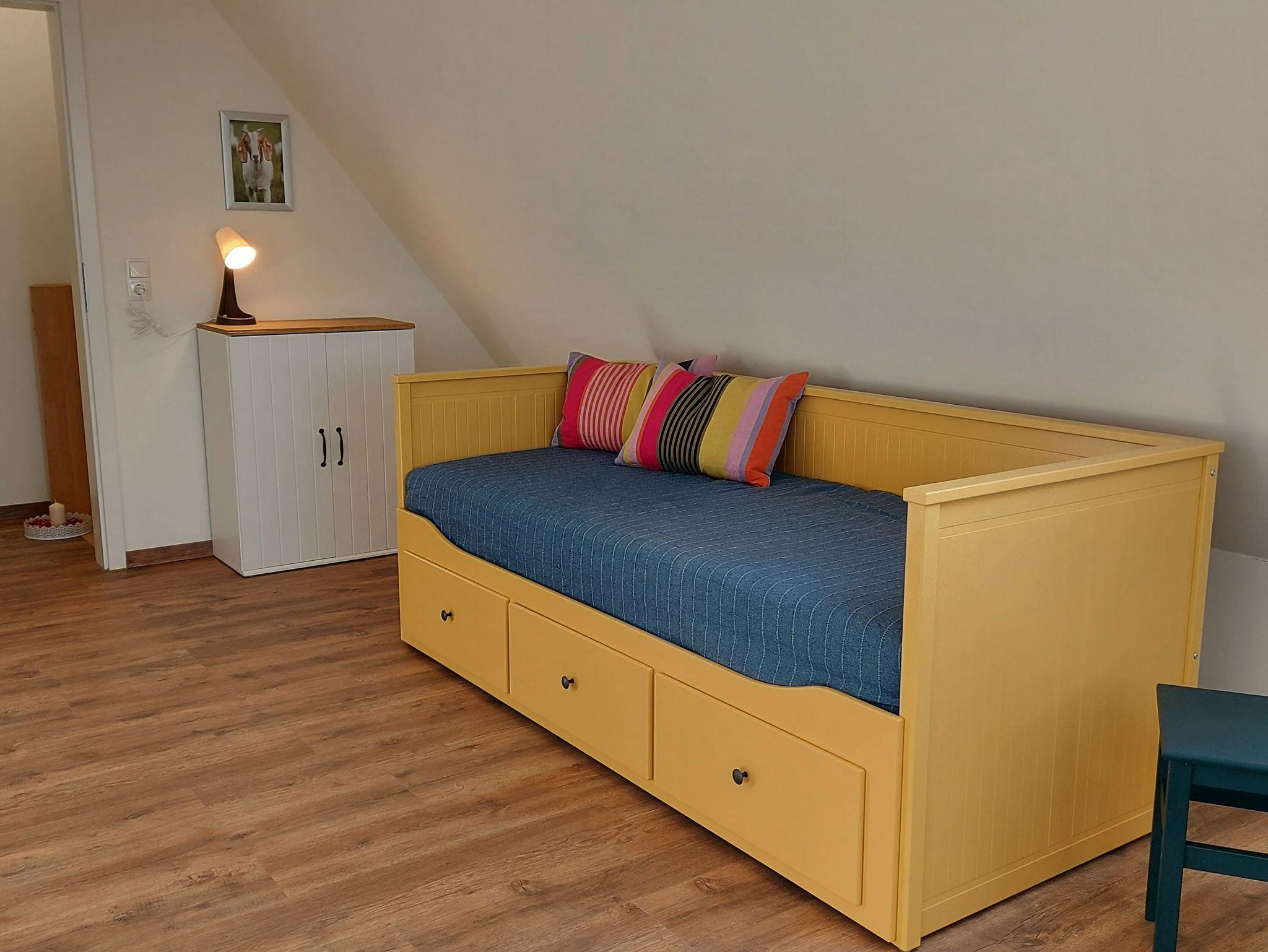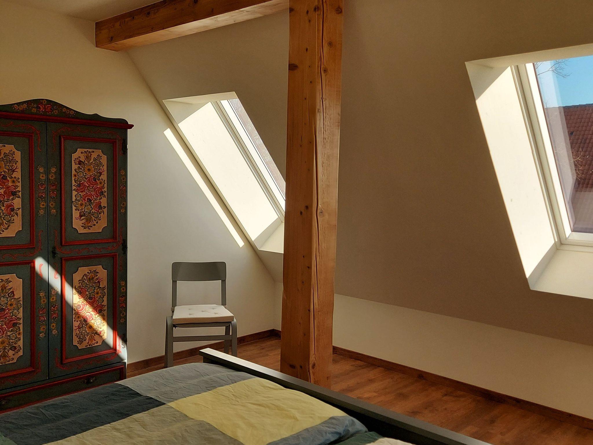 Im zweiten Obergeschoss: Wohn-/Schlafraum mit TV, Schlafcouch für 2 Personen (1,80 x 2 m) und Ausziehbett für 2 Personen (je 0,90 x 2 m). Der weite Wiesenblick machen diesen Raum zu einem gemütlichen Rückzugsort.