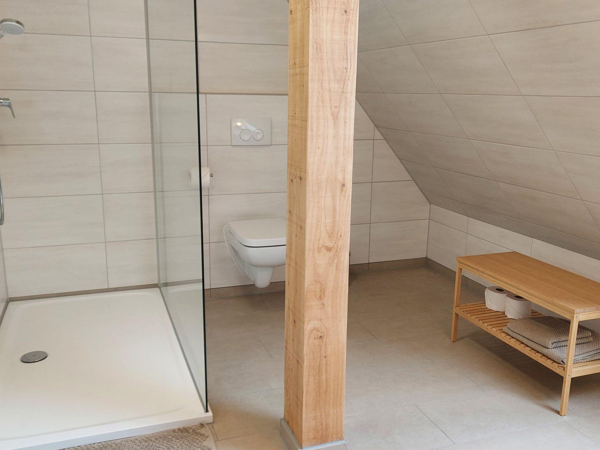 Im ersten Obergeschoss: gut ausgestattete Küche mit Esstisch, Backofen, Kühlschrank mit Gefrierfach, 4-Platten-Herd, Kaffeemaschine, Wasserkocher und Toaster. Schlafraum 1 mit Doppelbett (2 x 0,90 x 2 m). Bad mit ebenerdiger Dusche und WC.