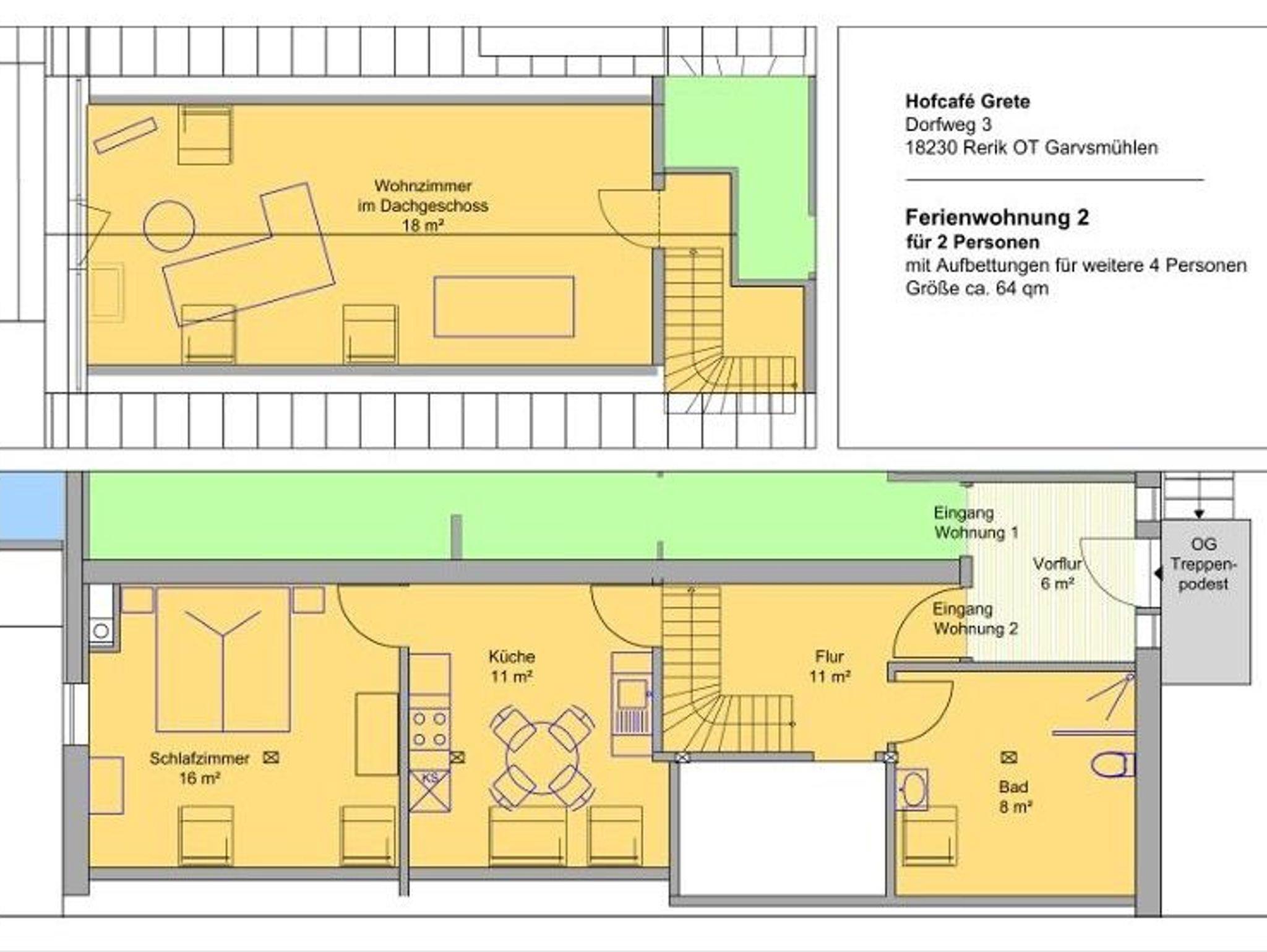 H3 Wohnen am Hofcafé mit Feierscheune Ostseebad Rerik, Nr.2/ 2-Raum-FeWo (links, 64m²) 2-5 Pers., OG