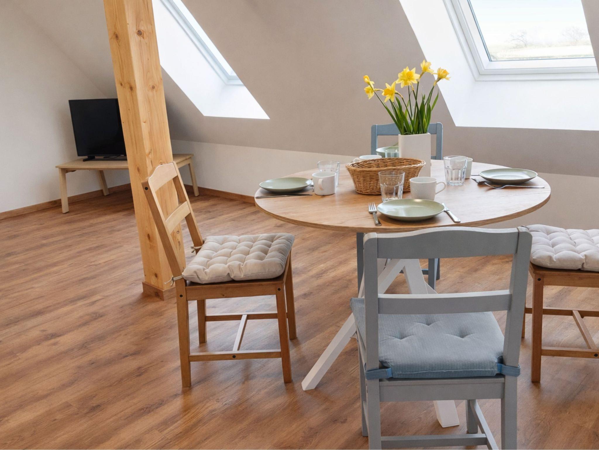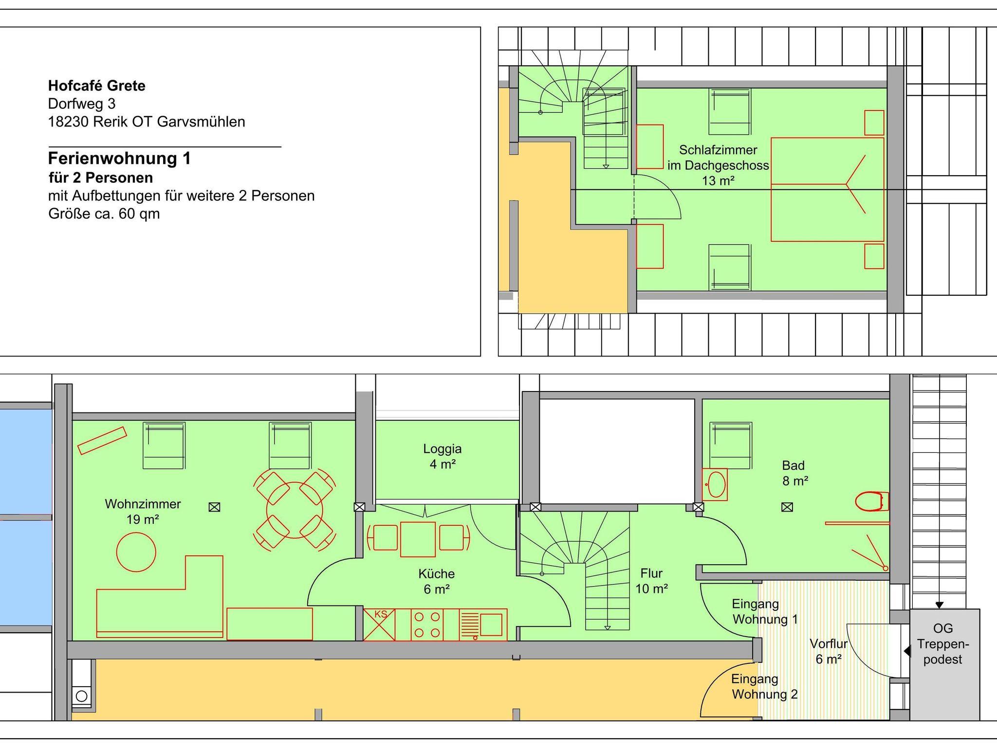 2-Raum-Ferienwohnung mit 60m² auf zwei Ebenen (OG Ober- und DG Dachgeschoss) Platz für 2 bis 4 Personen und ein Baby.