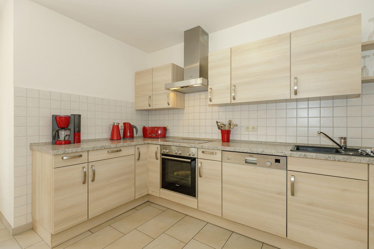Die zur Wohnfläche hin offene Küche ist hochwertig ausgestattet: Ihnen stehen hier neben Herd, Backofen, Kühlschrank mit Gefrierfach, Spülmaschine, Kaffeemaschine, Wasserkocher und Toaster auch sämtliche Küchenutensilien, Geschirr und Besteck zur Verfügung. So können Sie mühelos eigene Mahlzeiten zubereiten – ein Esstisch ist selbstverständlich vorhanden.