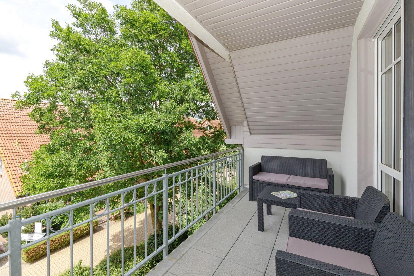 Ein besonderes Highlight dieser Unterkunft ist die überdachte Süd-West-Logia, auf der Sie herrliche Stunden im Freien verbringen können, während Sie sich zurücklehnen und mit Blick in Richtung Salzhaff die frische Seeluft genießen. Für entspannte Abende steht Ihnen eine gemütliche Sofaecke zur Verfügung, die ein idealer Ort zum Lesen oder zum Genuss eines Films ist.