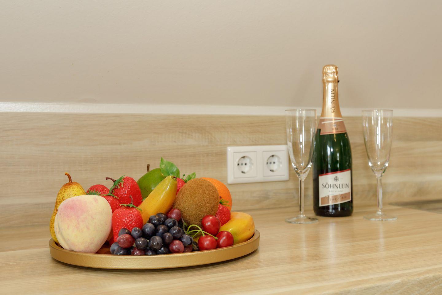 Im Herzen der Suite befindet sich eine offene Küche, die mit sämtlichen modernen Geräten ausgestattet ist, darunter ein Herd, ein Kühlschrank mit Gefrierfach, ein Backofen und eine Spülmaschine. Sie finden auch eine Kaffeemaschine, sowie eine Kaffeepadmaschine vor, die perfekt für den Genuss eines duftenden Morgenkaffees ist. Neben dem Essbereich, der Platz für gesellige Mahlzeiten bietet, stehen auch zahlreiche Küchenutensilien und Geschirr zu Ihrer Verfügung, sodass Sie sich wie zu Hause fühlen können.