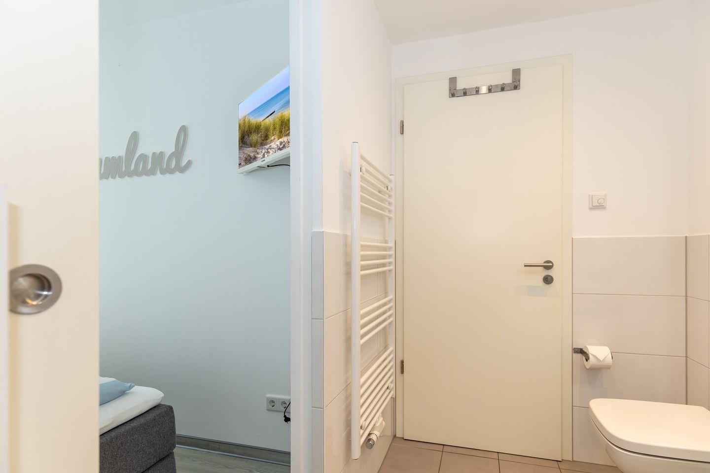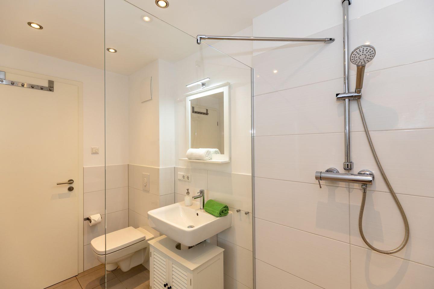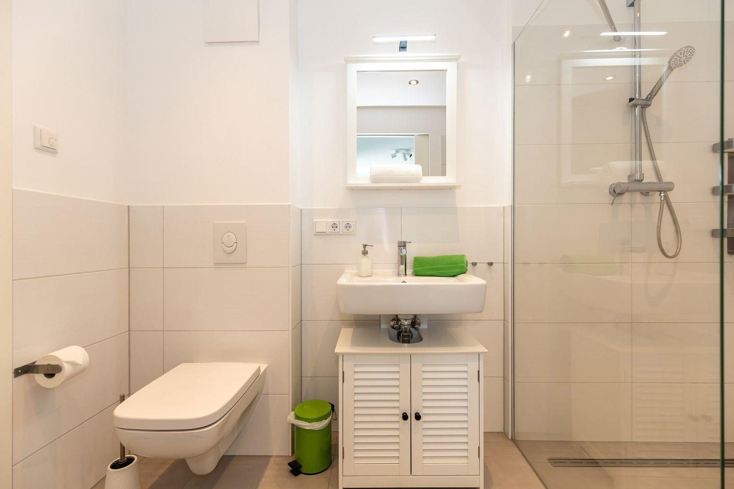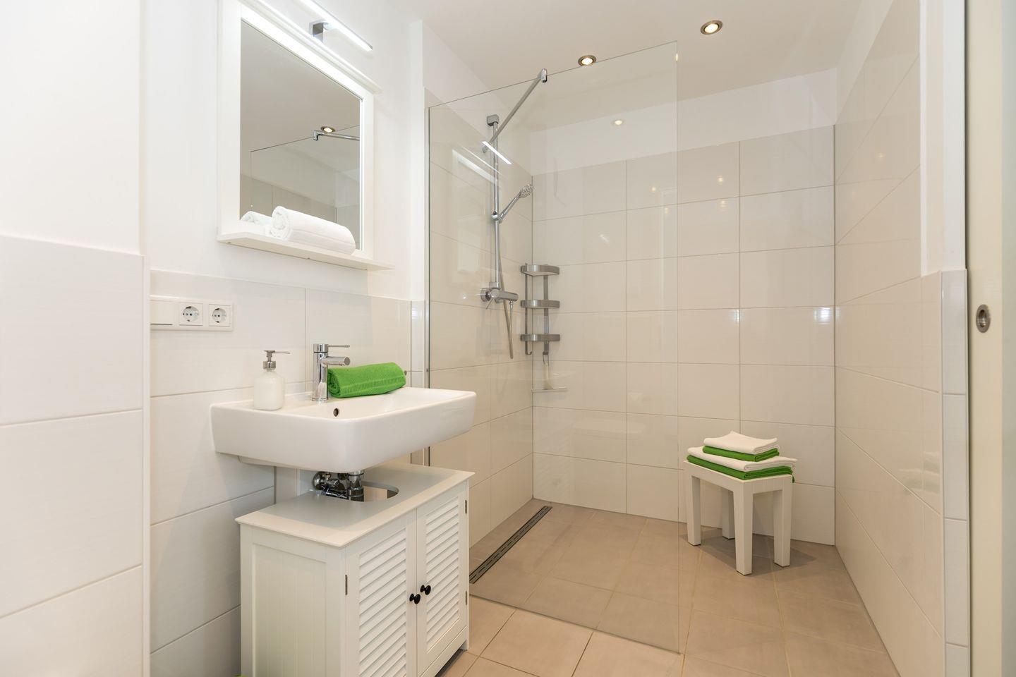 Das schicke Bad hat eine bodengleiche Dusche.