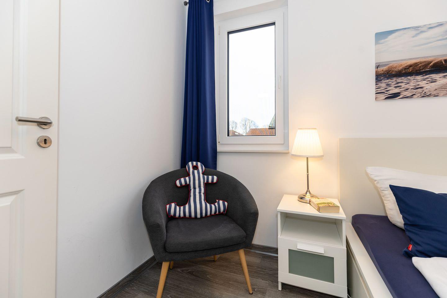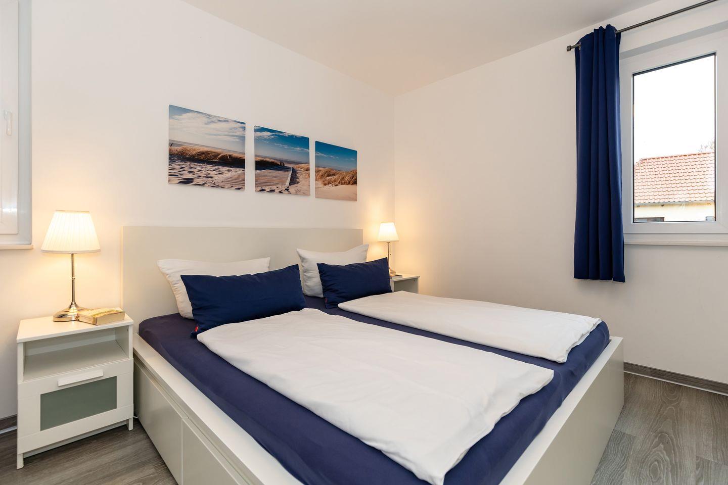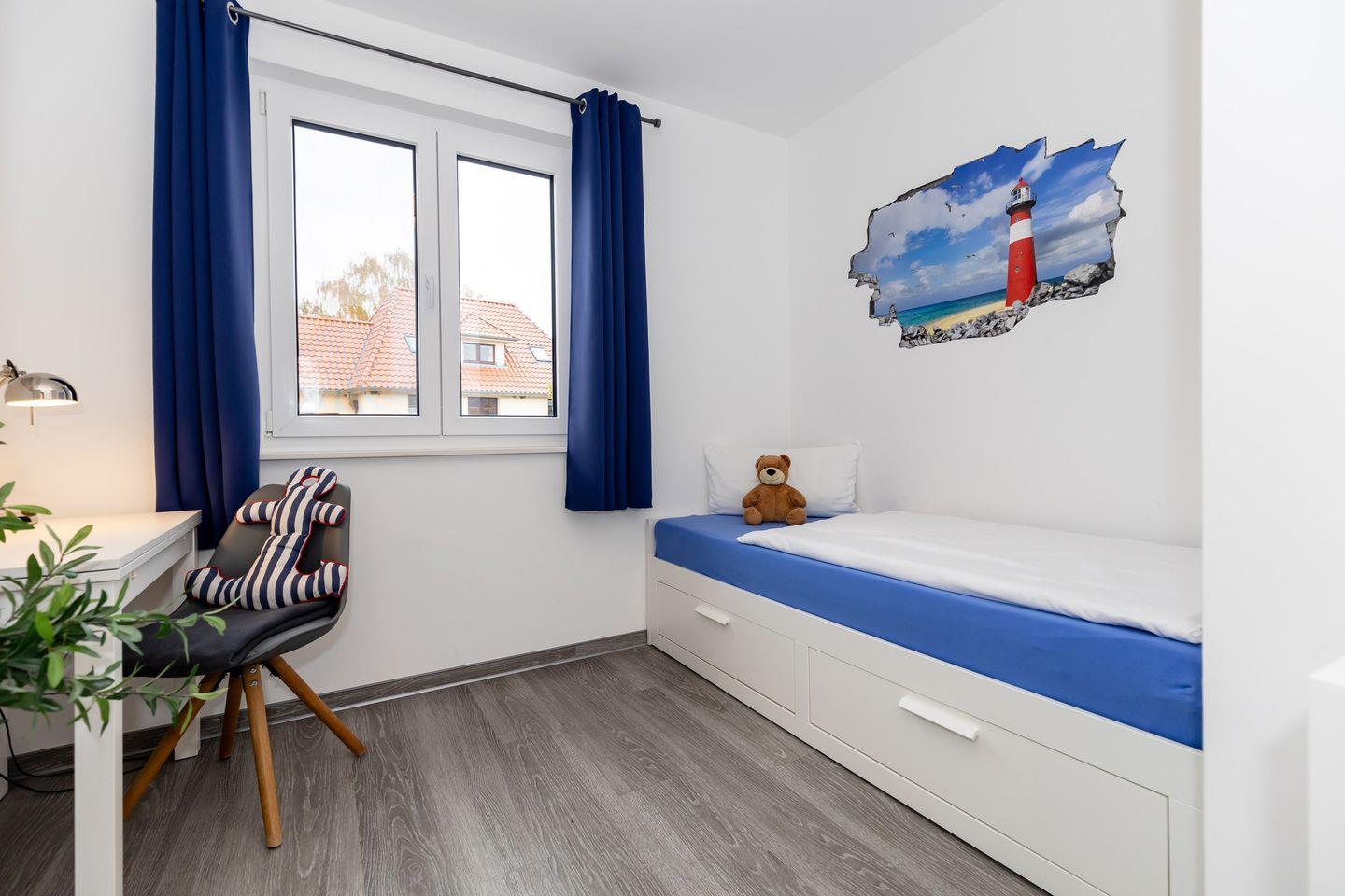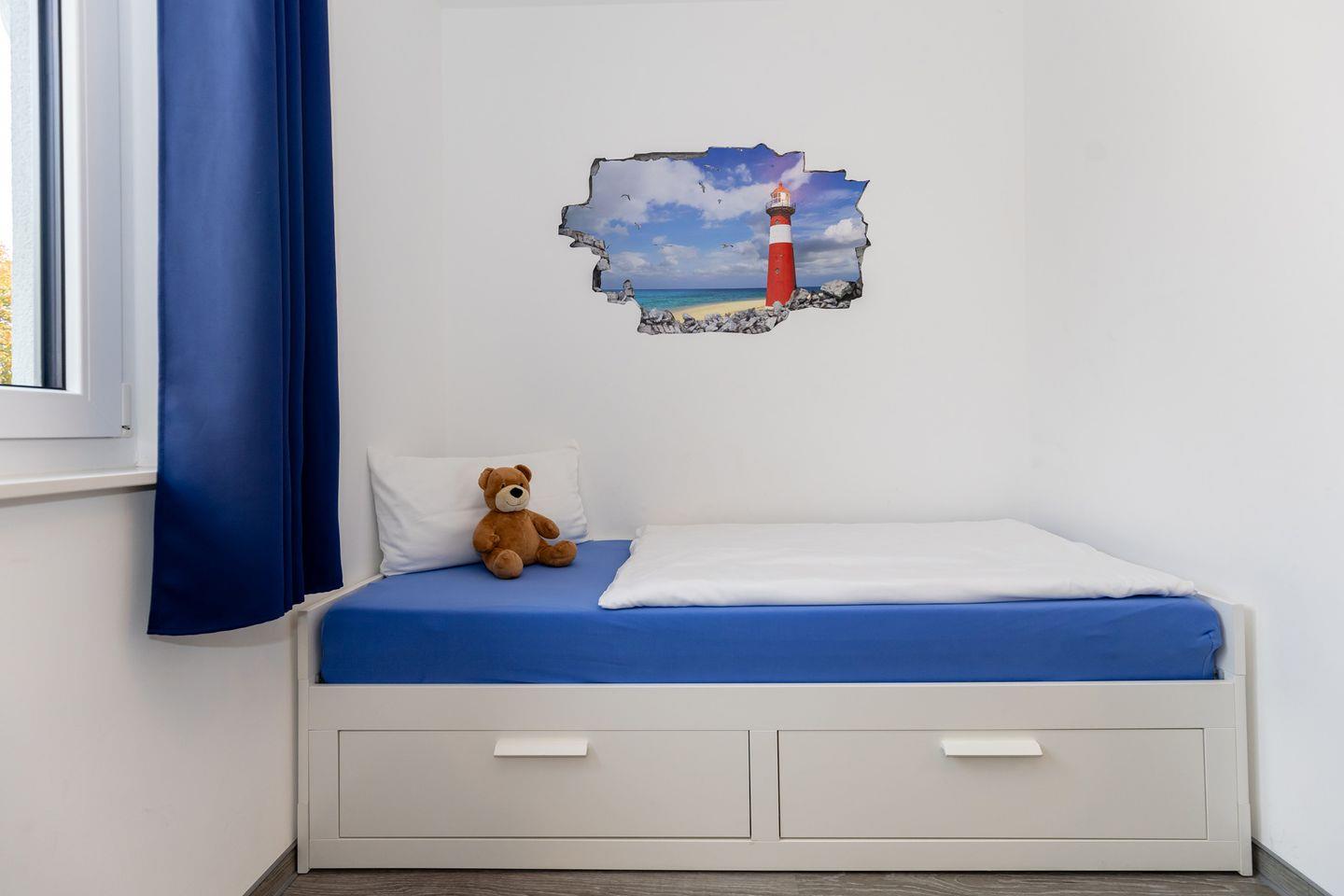 Das Schlafzimmer mit einem komfortablen Doppelbett (180x200) sorgt für erholsamen Schlaf, während das Kinderzimmer mit zwei Einzelbetten (80x200) ideal für die kleinen Gäste ist. Bettwäsche und Handtücher für bis zu vier Personen sind im Mietpreis enthalten, sodass Sie sich um nichts kümmern müssen.