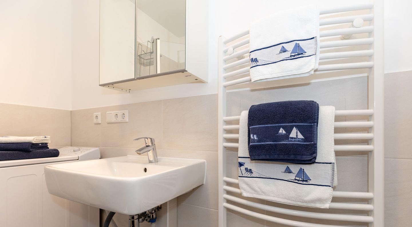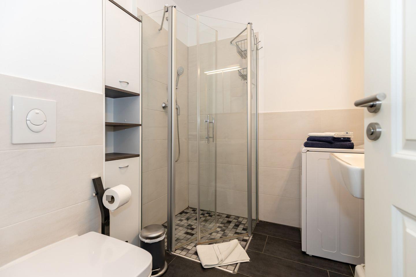 Das stilvolle Badezimmer verfügt über eine bodengleiche Dusche und eine Waschmaschine, was zusätzlichen Komfort bietet. Der pflegeleichte Fliesenboden sorgt für eine angenehme Atmosphäre und einfache Reinigung.