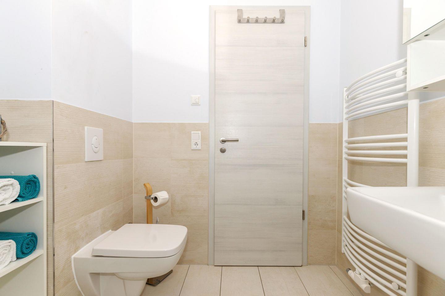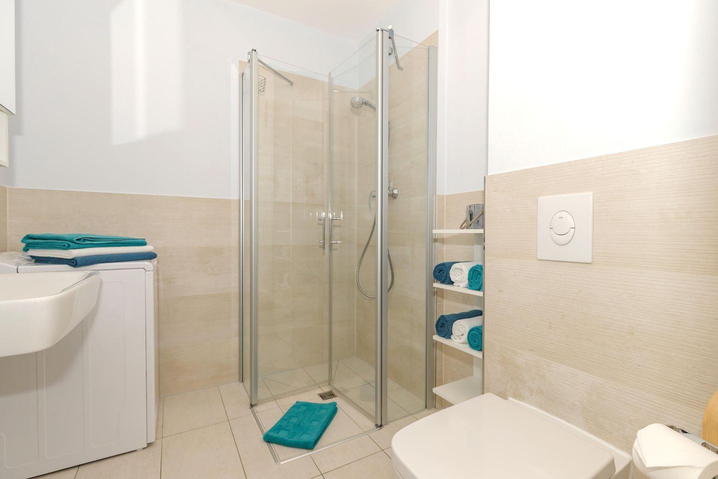 Das schicke Bad hat eine bodengleiche Dusche, sowie eine Waschmaschine.