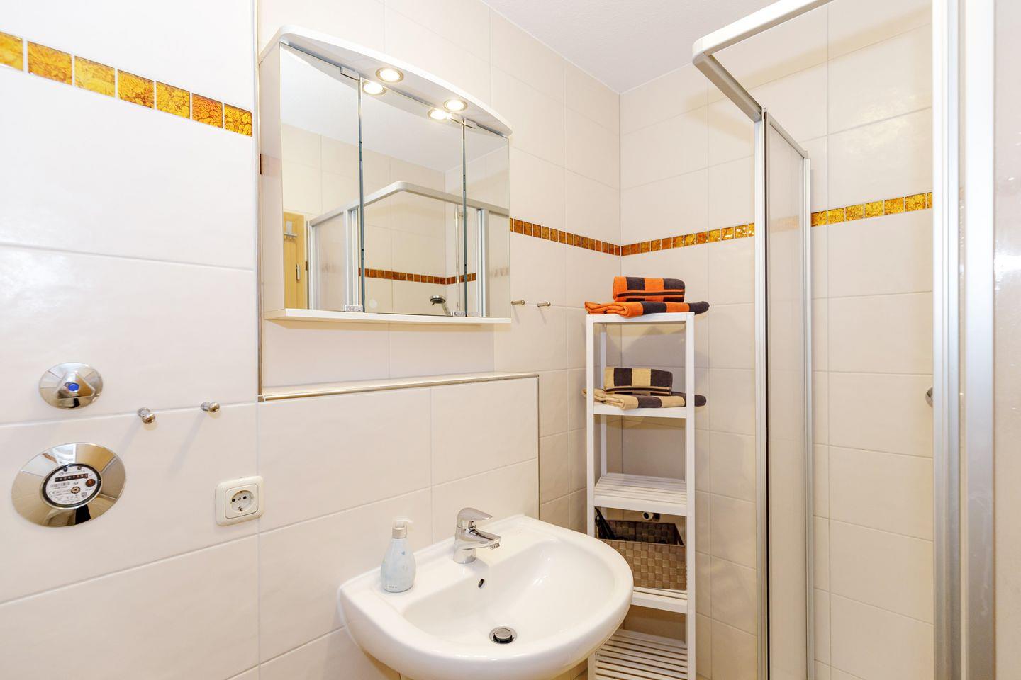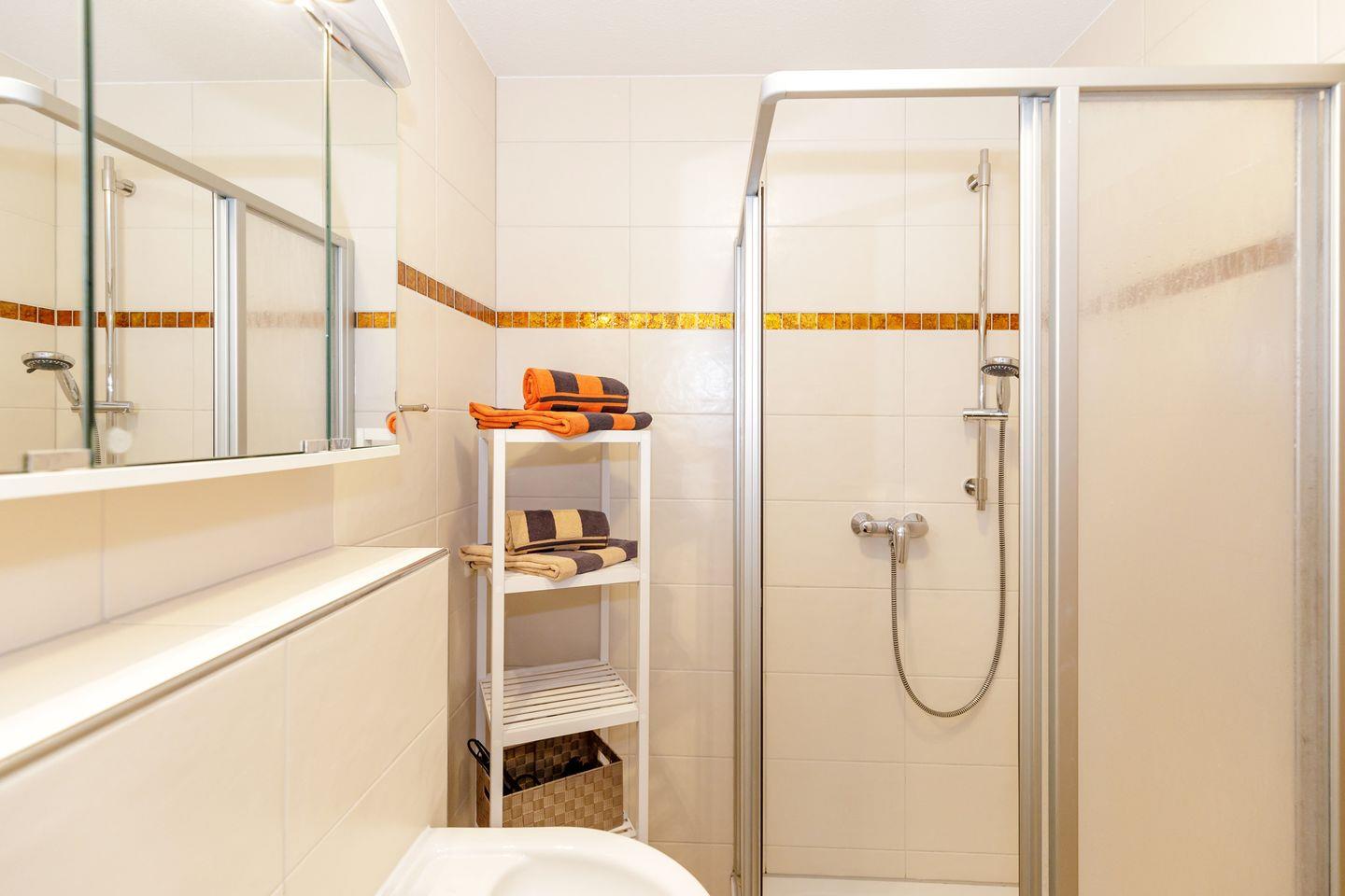 Die komplette Wohnung ist mit Fliesen ausgestattet, das Bad mit Dusche hat eine Fußbodenheizung.