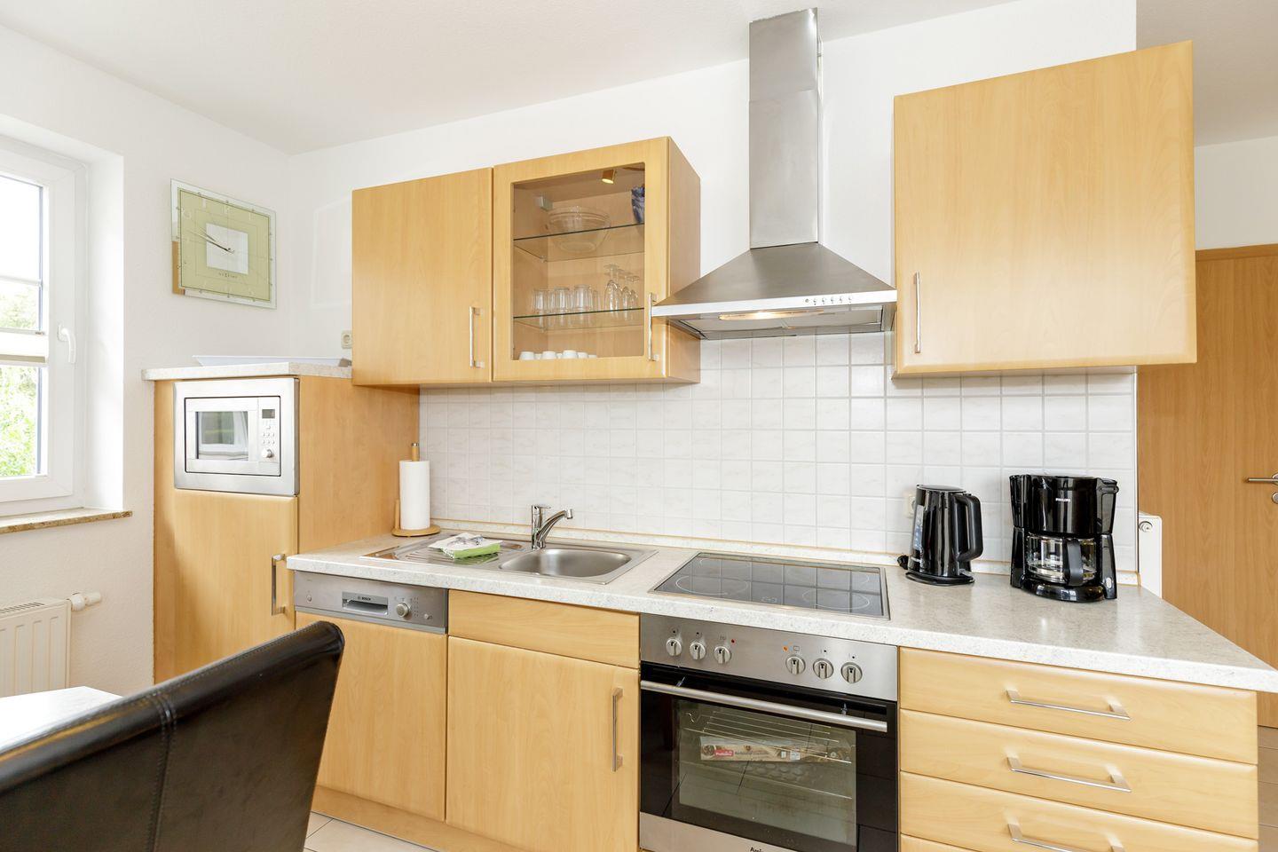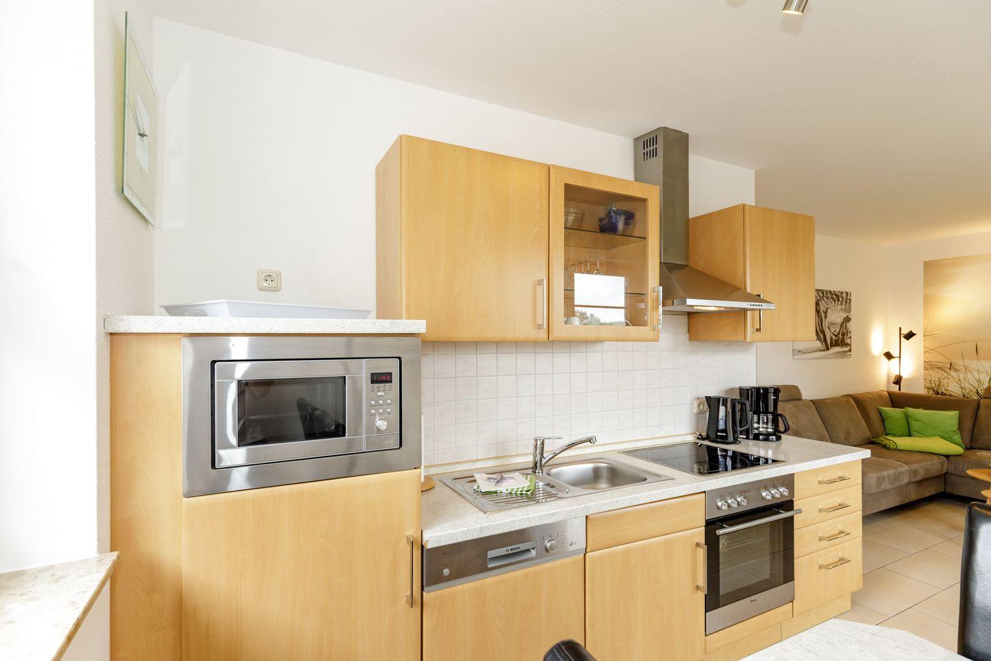 Im Wohn/Essbereich mit Flach-TV befindet sich auch die komfortabel ausgestattete Küche.