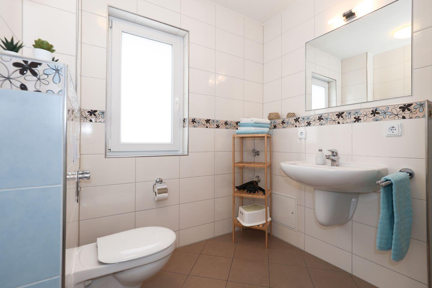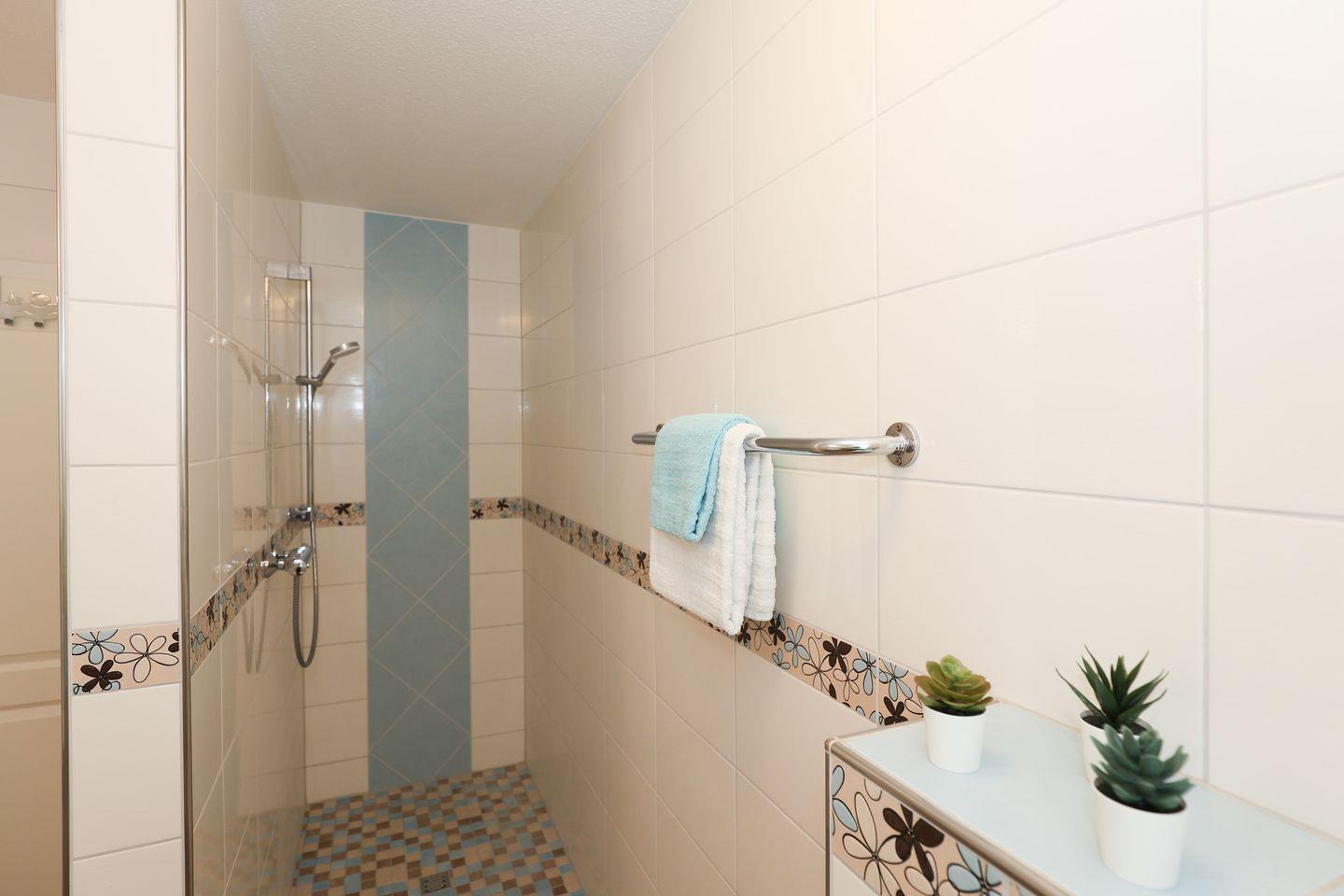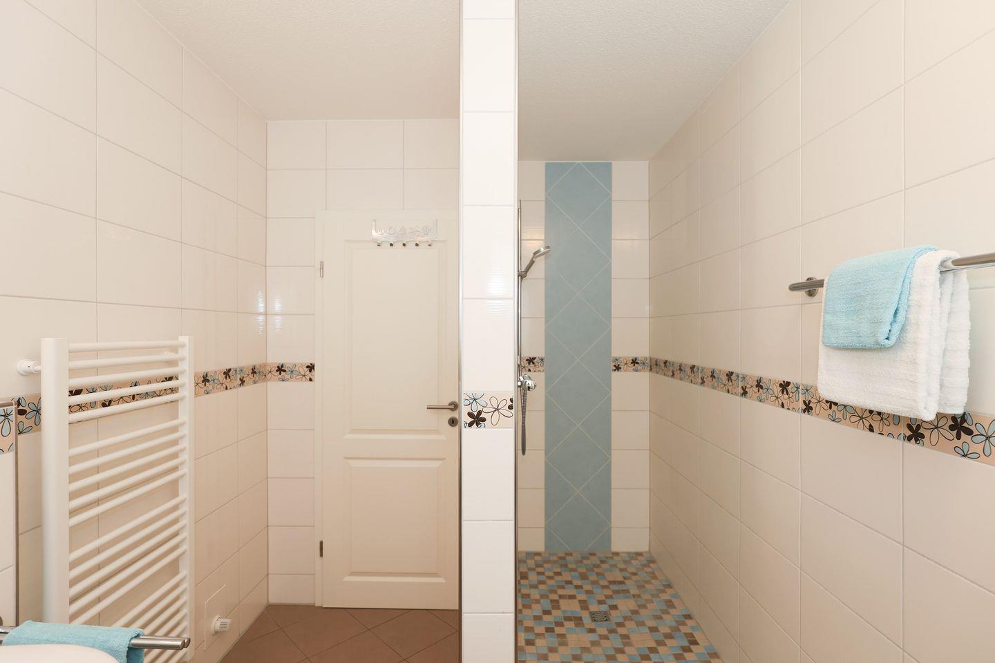 Das große und moderne Badezimmer (mit Tageslicht / Fenster) verfügt über einen sehr großen Duschbereich (180 cm x 90 cm) mit ebenerdigem Einstieg (seniorenfreundlich!) und thermostatgeregelter Duschbrause, Waschbecken, WC, Föhn, Handtuch-Heizkörper, Fußbodenheizung sowie ausreichend Ablagemöglichkeiten.