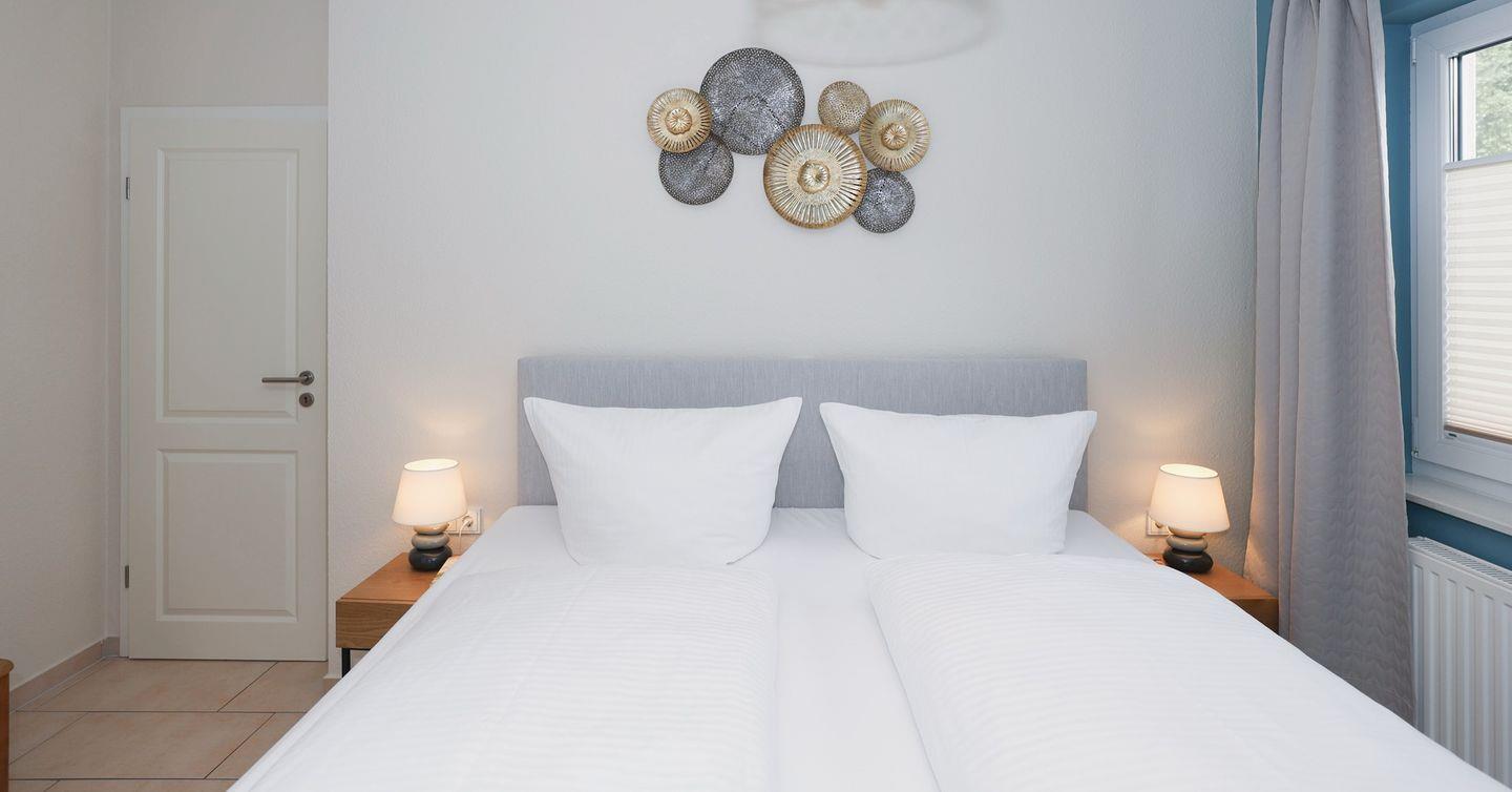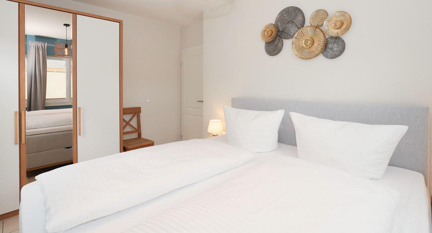 Das freundliche 1. Schlafzimmer ist mit einem bequemen Doppelbett, Nachttischen sowie einem geräumigen Kleiderschrank eingerichtet. Das separate 2. Schlafzimmer verfügt über 2 getrennte Boxspring-Einzelbetten, einen Nachttisch sowie einen geräumigen Kleiderschrank. Bettwäsche und Handtücher können hinzugebucht werden.