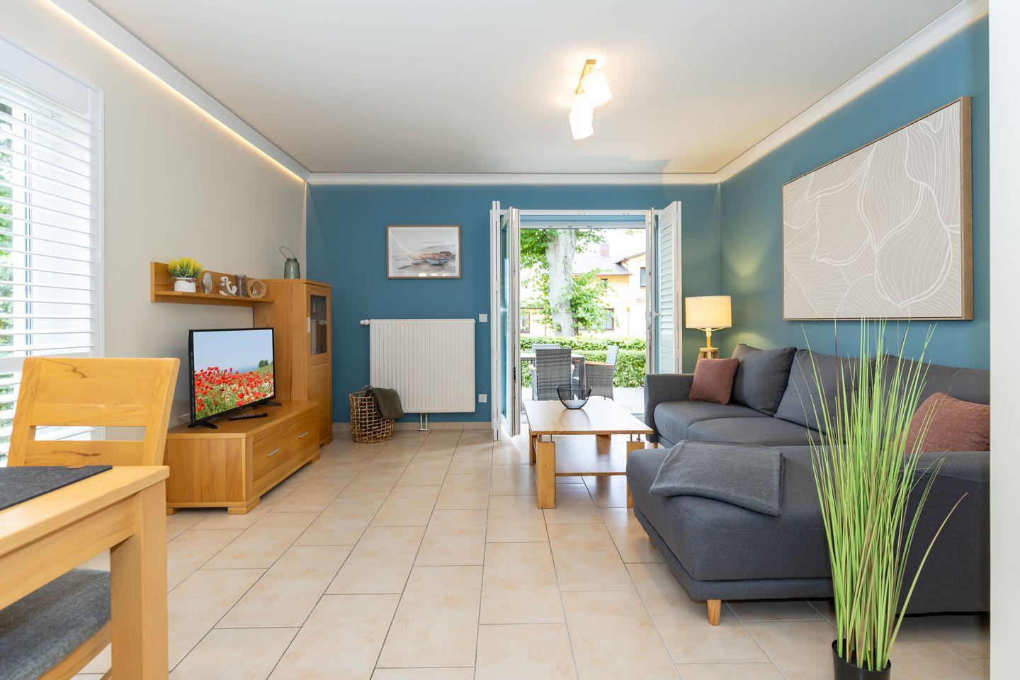 Das geräumige Wohn-/Esszimmer verfügt über eine separate Sitzgruppe mit großer, bequemer Couch und Couchtisch, einen separaten Esstisch mit 4 Stühlen sowie ein Sideboard. Vom Wohnzimmer aus haben Sie direkten Zugang zu der ca. 16 m² großen und sonnigen Terrasse (nach Süden ausgerichtet) mit Terrassenmöbeln und kleinem Gartenanteil - hier sitzen Sie entspannt und gemütlich im Grünen!