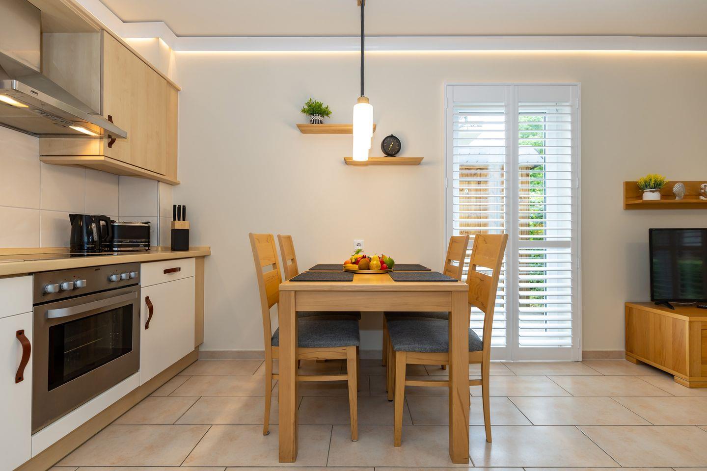 Die offene Küche beinhaltet eine voll ausgestattete Einbauküchenzeile mit 4-Platten-Ceran-Kochfeld, Backofen, Dunstabzug, Mikrowelle, Kühlschrank mit Gefrierfach, Geschirr-spülmaschine, Kaffeemaschine, Wasserkocher und Toaster. Die Küche ist mit Geschirr, Gläsern, Besteck und Töpfen bestens und ausreichend ausgestattet.