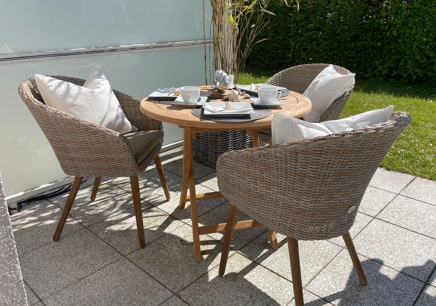 Die angrenzende sonnige Terrasse, ausgerichtet nach Südwesten, lädt dazu ein, die lauen Sommernächte im Grünen zu genießen – ein idealer Ort für romantische Dinner unter dem Sternenhimmel.