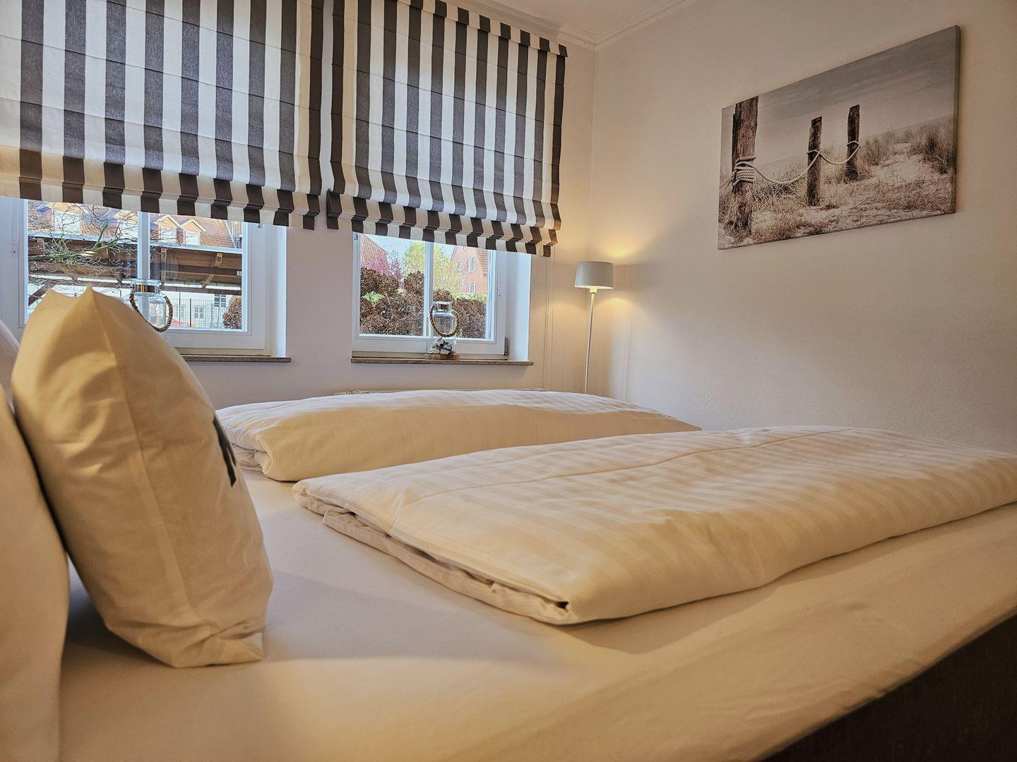 Das helle Schlafzimmer mit einem komfortablen Box-Springbett ist der Rückzugsort für erholsame Nächte. Hier finden Sie Ruhe und Geborgenheit, während der Alltag draußen bleibt. Die Bettwäsche und flauschige Handtücher können Sie gerne hinzubuchen.