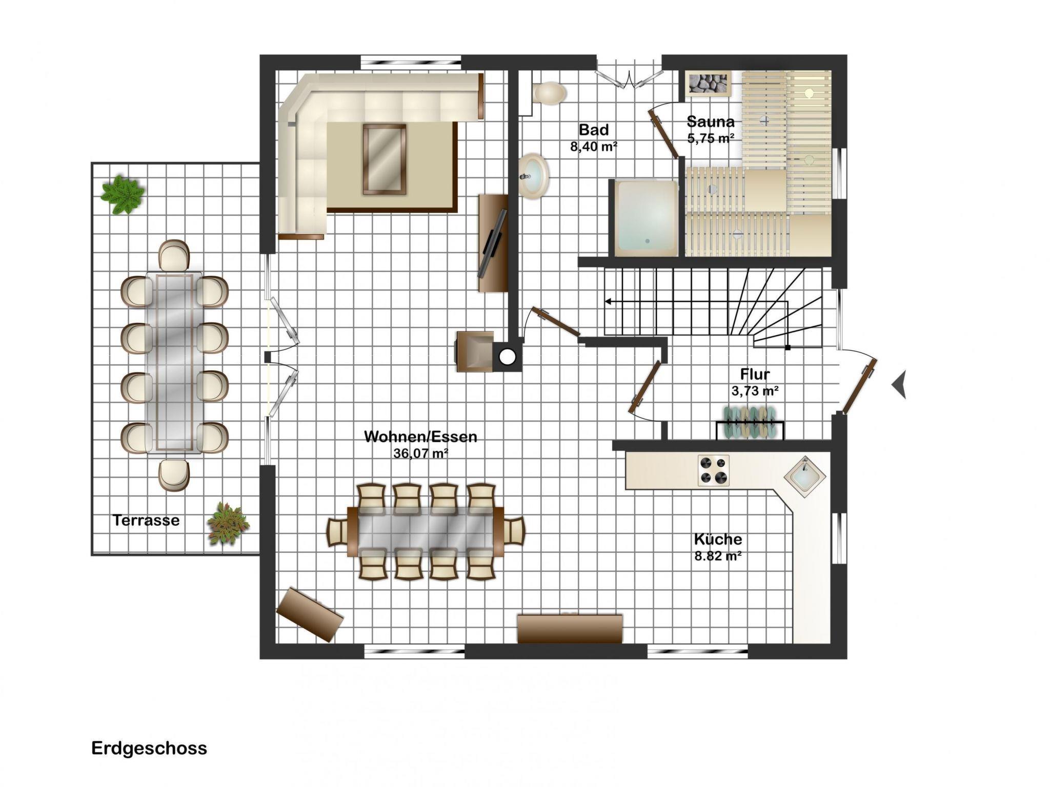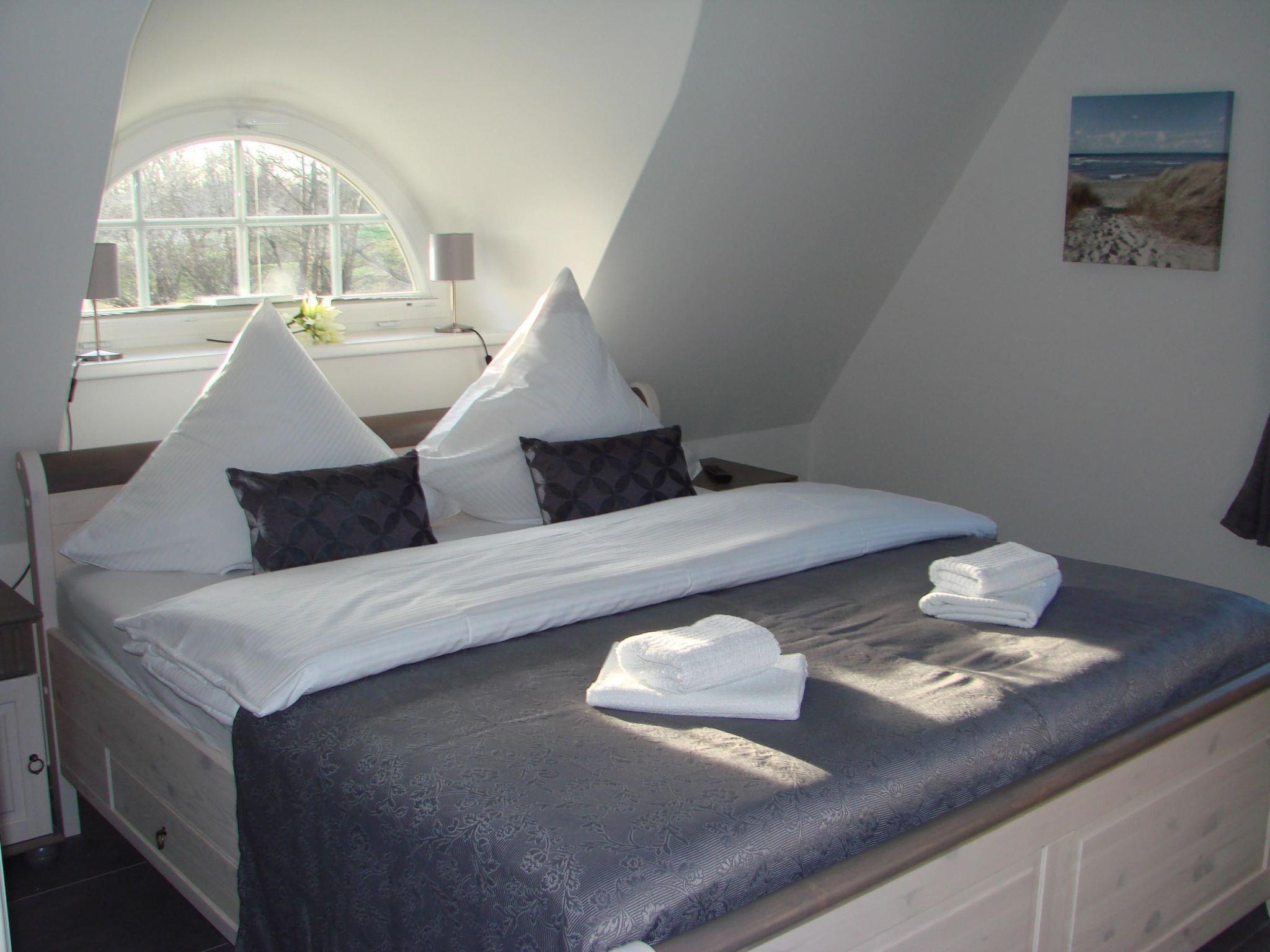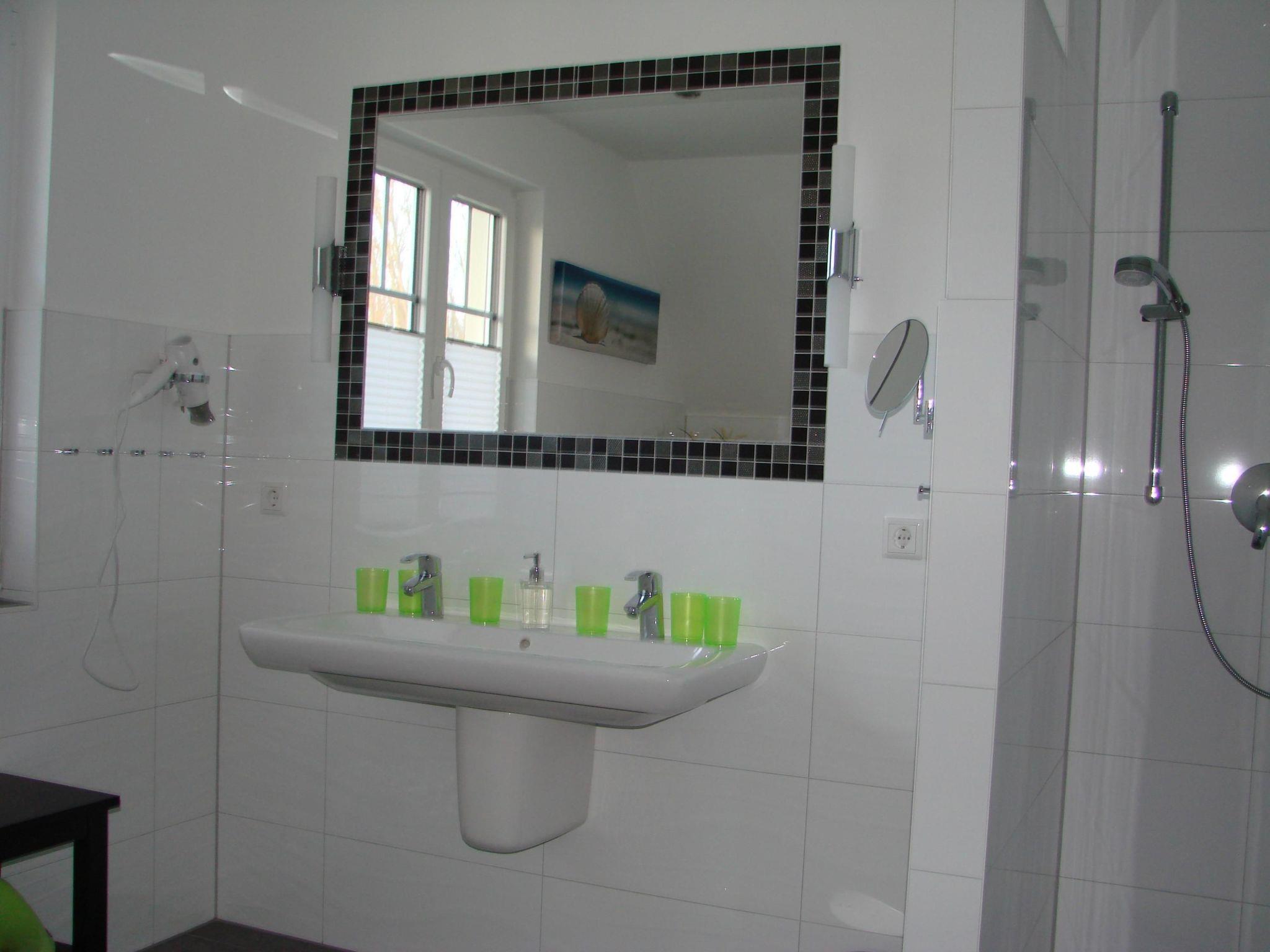 You can open the entrance door to the outside with your individual access code, making it easy to get into the house. On the ground floor there is a large living/dining room with a cosy leather seating area, wood-burning stove and a large dining table for ten people as well as a high-quality, fully equipped fitted kitchen. There is also a large shower room with sauna. If you are not out and about, you can enjoy satellite TV or a good film on DVD from the living area. For those who prefer music, there is a stereo system with radio/CD, iPod and USB connection. Or you can relax in front of the wood-burning stove and listen to the crackling of the fire. A modern, fully equipped and spacious eat-in kitchen is available so that you can indulge in your culinary hobby while on holiday. It offers you a large fridge with freezer compartment, induction hob, extractor bonnet, raised oven, dishwasher, microwave, etc. There is also a washing machine at your disposal. A high chair is available for your small child. The modern bathroom consists of a sauna, floor-level shower, toilet and washbasin. After your sauna session, you can step out into the fresh Baltic Sea air via a double door. A hairdryer is provided for your wet hair. A fly screen door protects you from unwanted visitors.