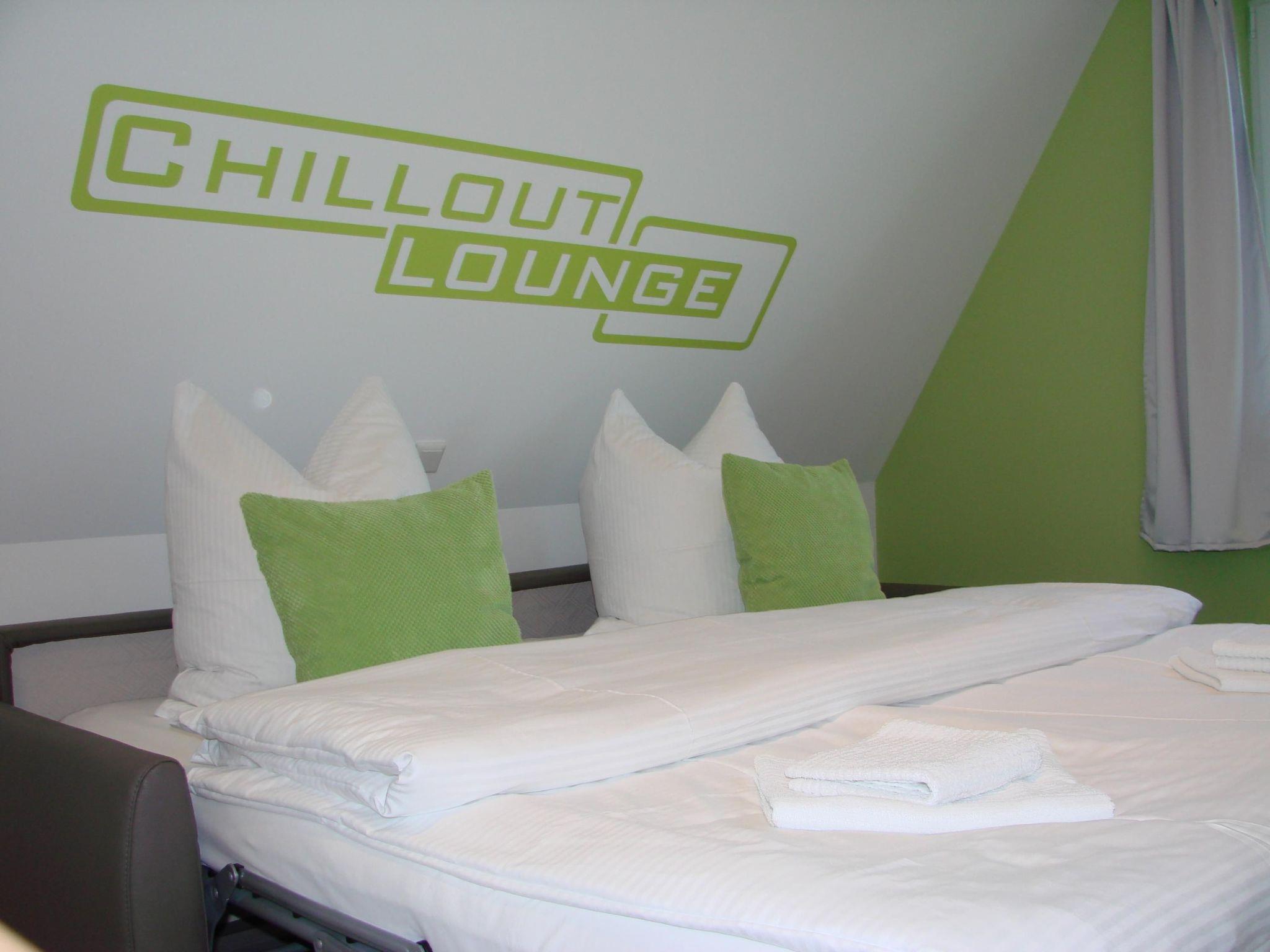 The converted loft is the ideal home for your children. There are two bedrooms. The bunk room with two beds (90x200 cm), desk and wardrobe. The chill lounge is furnished with a high-quality leather sofa bed (consisting of two 90x200 cm mattresses) at a comfortable height, bedside tables, wardrobe, sideboard and satellite TV. Here, too, the windows are protected by fly screens and darkening is provided.