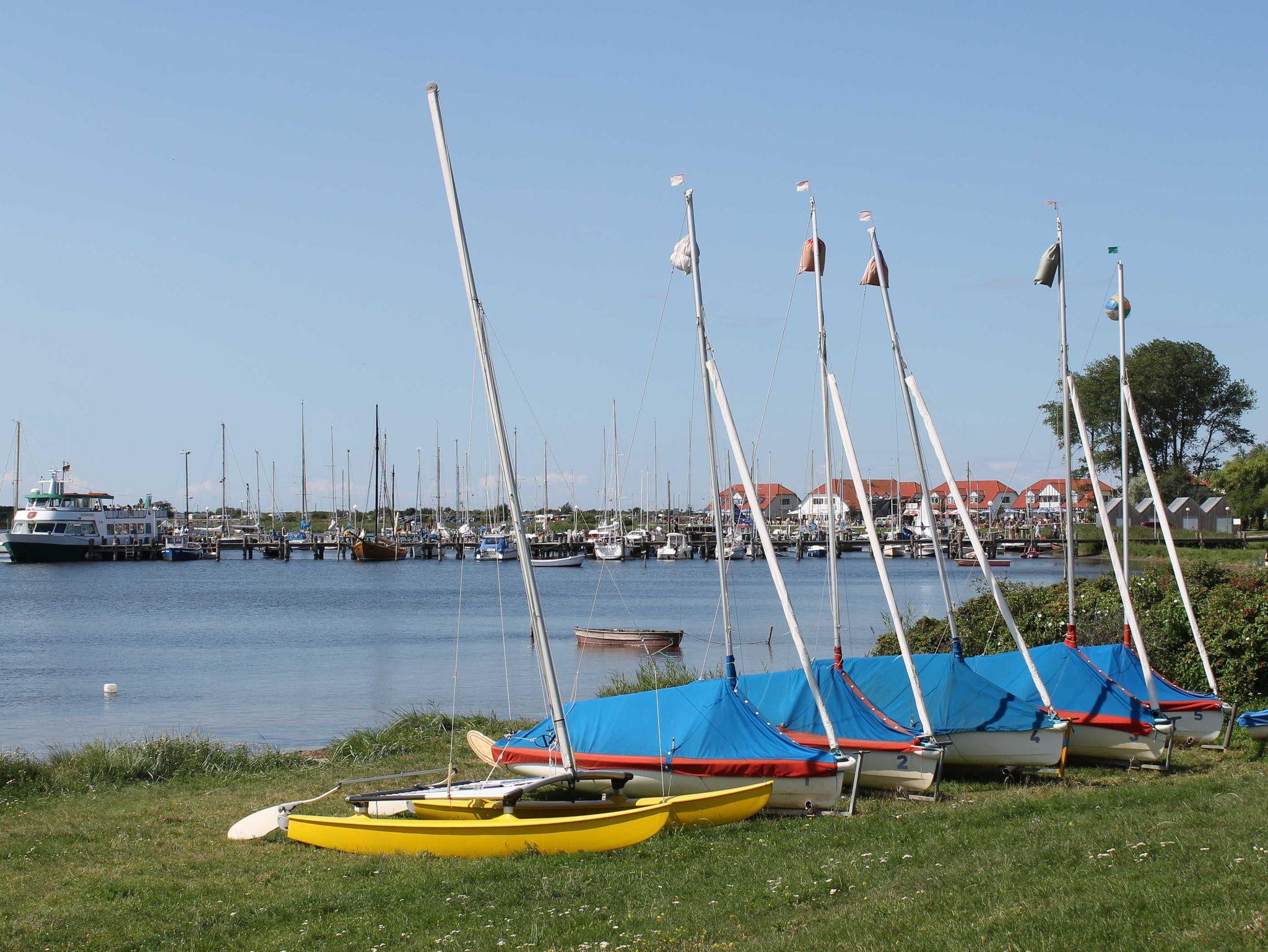 Der Strand ist 500m am Fuße der Steilküste zu entdecken. Ein belebter, breiter Sandstrand an der Seebrücke mit Strandkorb-, Fahrrad- und Bootsverleih sowie vielfältiger Gastronomie und kleinen Geschäften ist 1000m entfernt. Das Salzhaff, eine flache, idyllische Ostseebucht mit Bootsverleih und Wassersportcenter ist ideal für Surf-, Segel- und Kitesurf-Anfänger. Busbahnhof, Fahrradverleih, Frisör, Post, Bank, Supermarkt und Geschäfte sowie der beliebte Haffplatz mit Café, Restaurants, Yachthafen und Seebrücke entlang der Strandpromenade ist 20 Fußminuten entlang der Küste erreichbar.