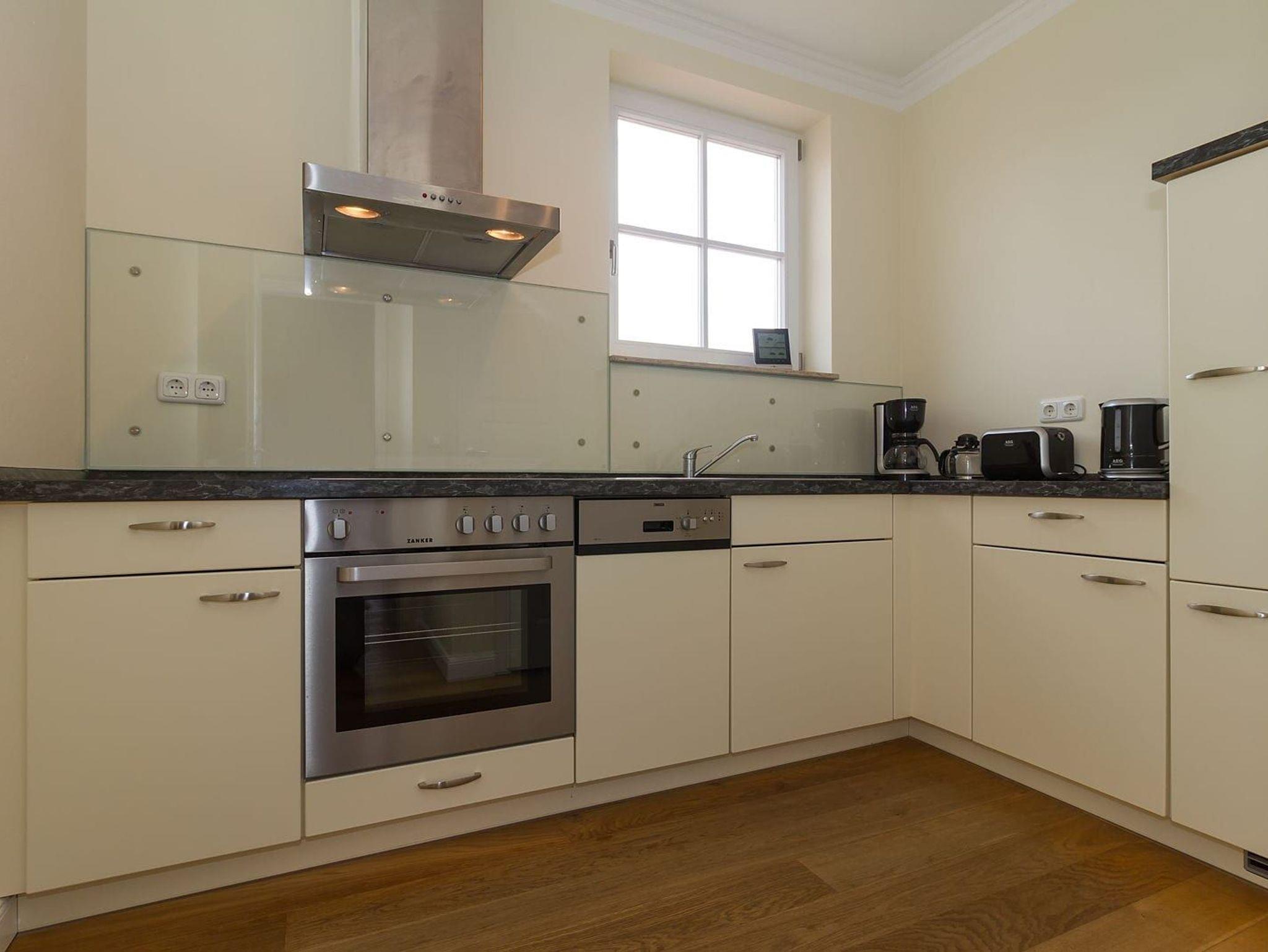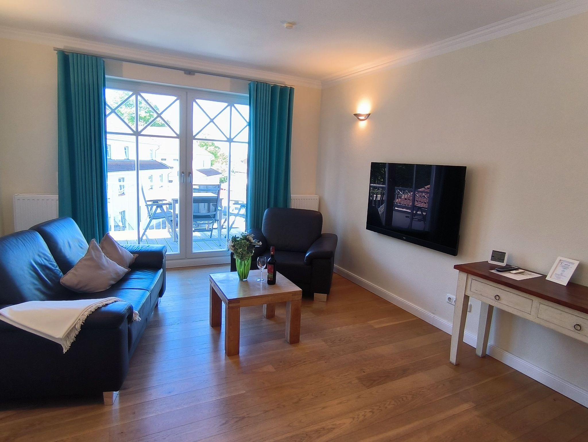 Der gesamte Wohnbereich, Küche und Schlafzimmer sind mit einem hochwertigen Dielenholzfußboden ausgestattet. Das Badezimmer ist gefliest. Auf den beiden Balkonen wurde Bangkirai Holz verlegt. Das Wohnzimmer bietet ein Ledersofa mit passendem Sessel und einen modernen LCD Fernseher. Wenn Sie lieber den Sonnenuntergang betrachten möchten, treten Sie einfach auf den Balkon und genießen Sie die Aussicht. Im Essbereich stehen 4 Stühle und ein großer Tisch zur Verfügung, ein Kinderhochstuhl ist ebenfalls vorhanden. Auf Freunde von Espresso oder Latte Macchiato wartet in der Küche eine Krups Espresso Maschine.