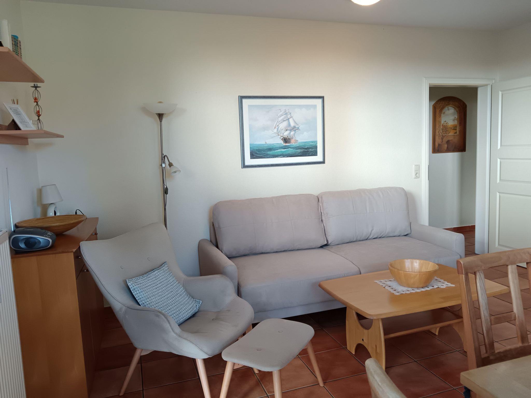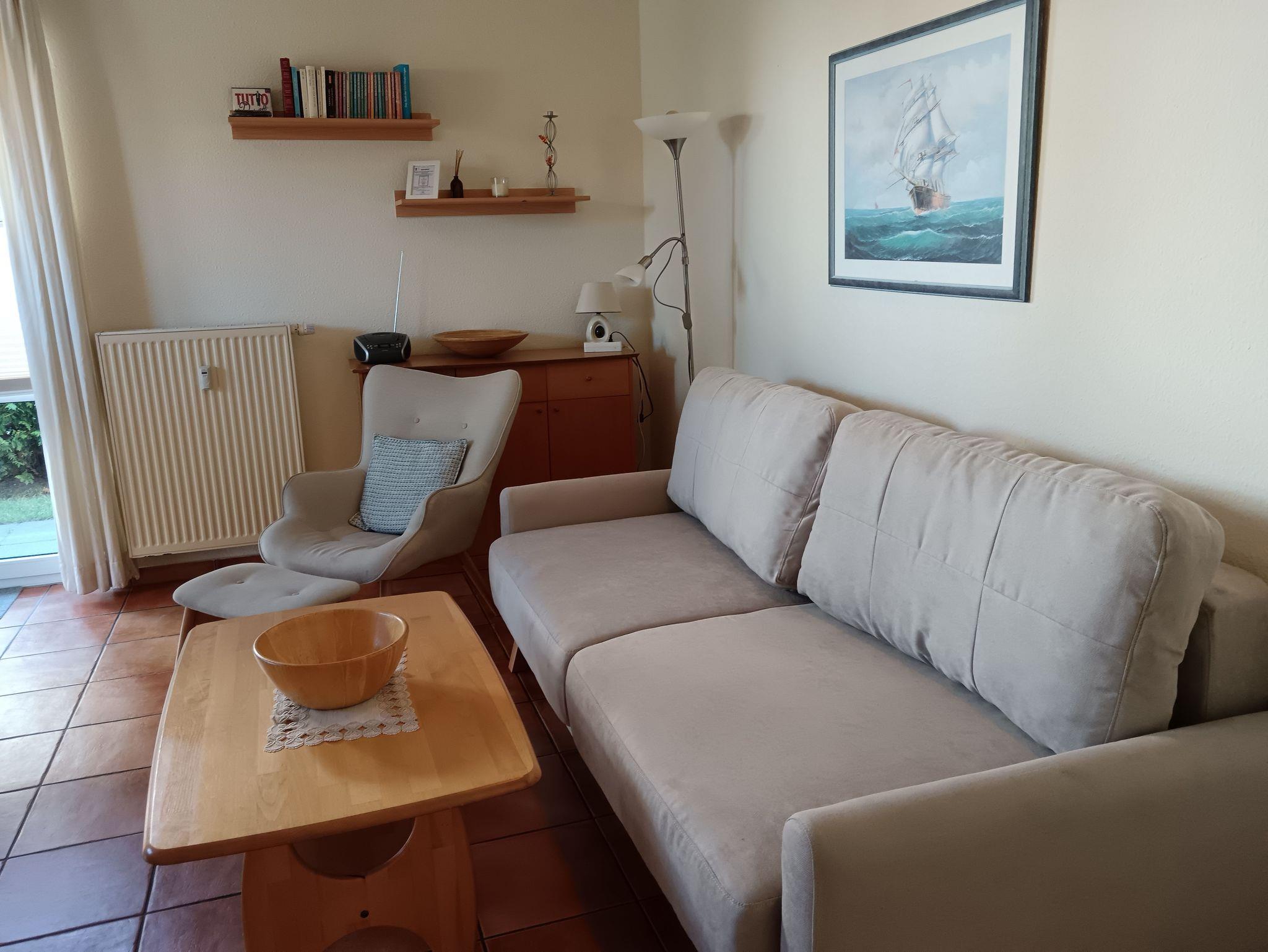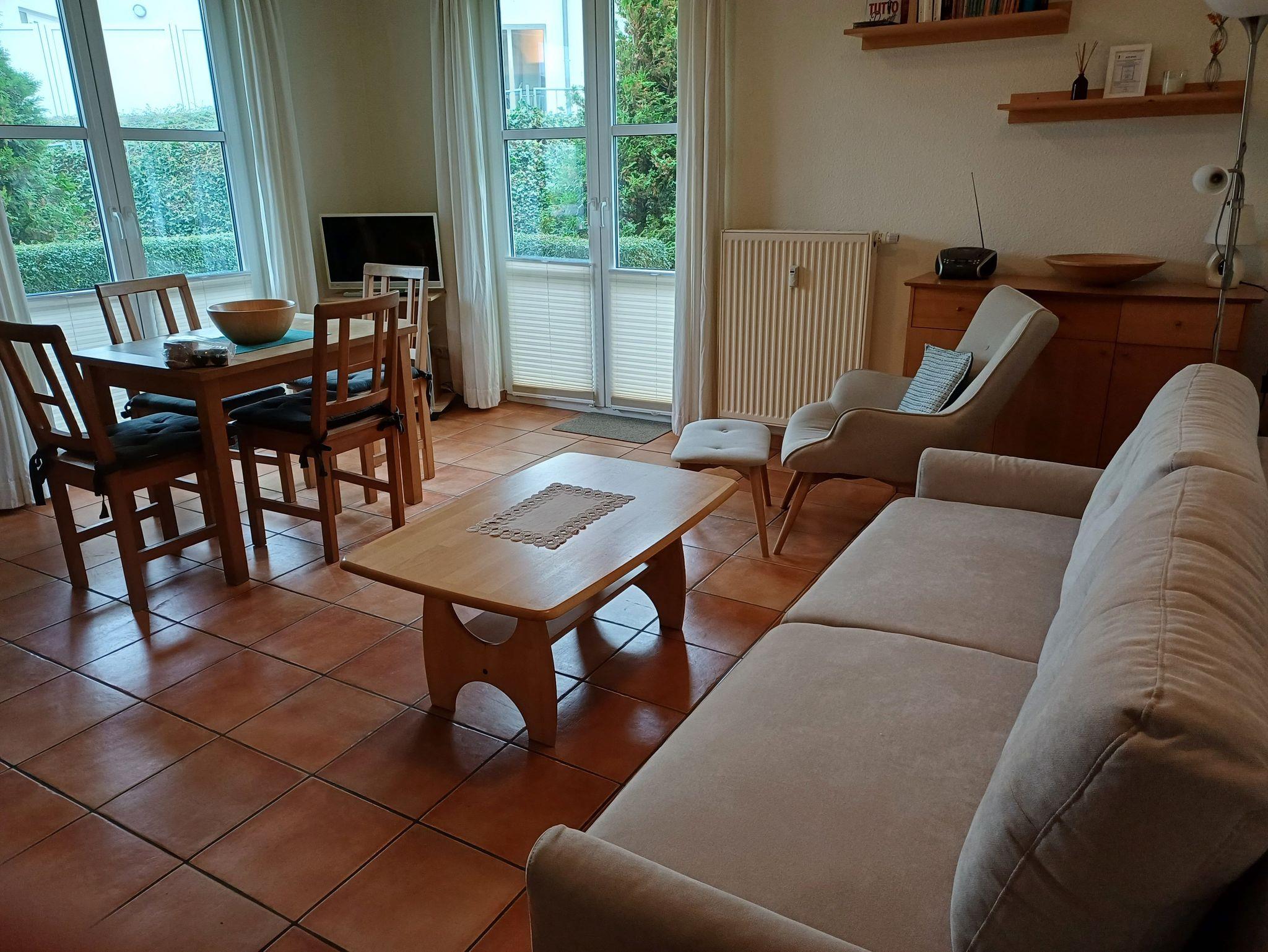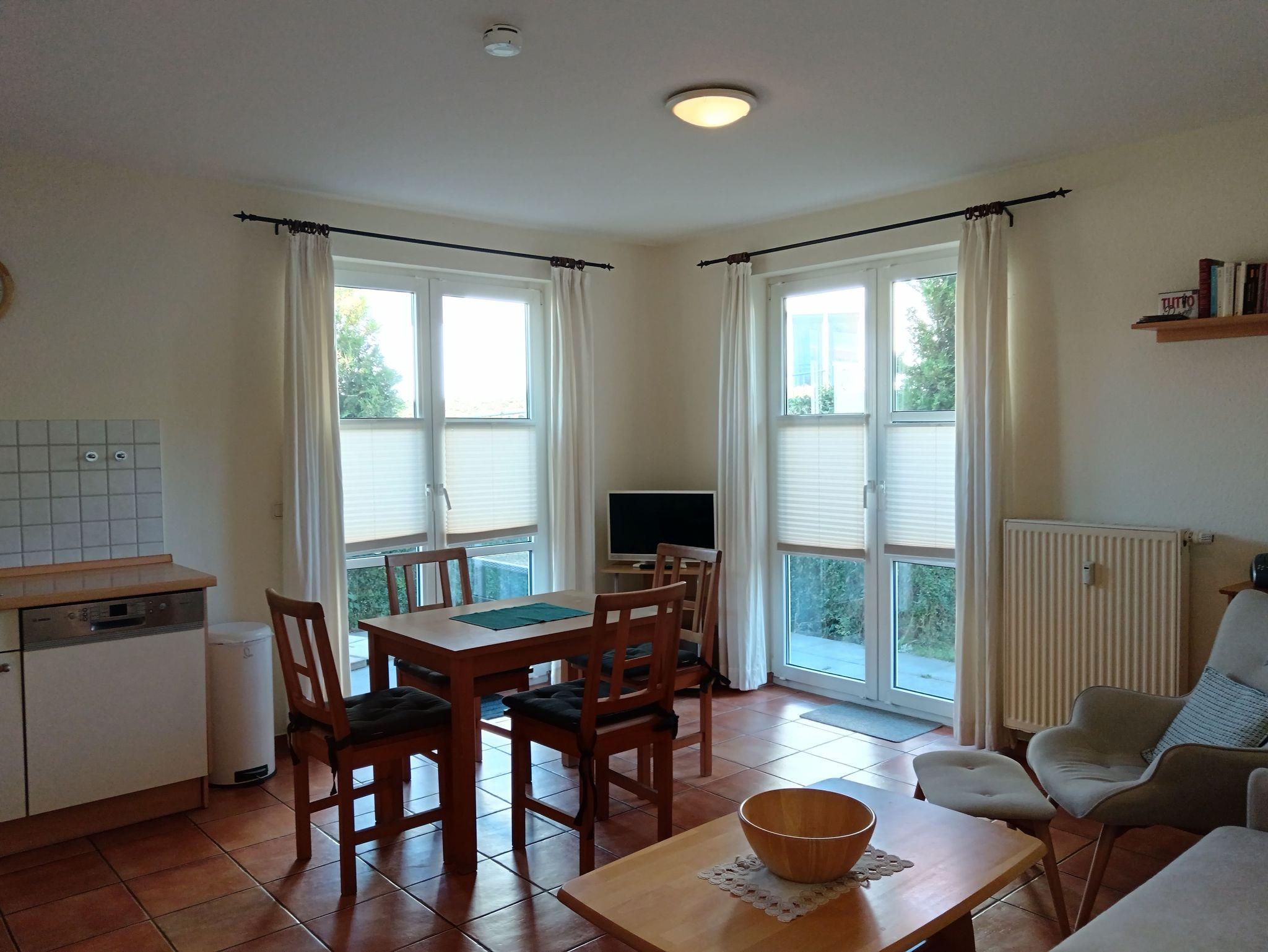 Die kleine, helle und freundliche Ferienwohnung ist ebenerdig mit Terrasse und Gartenzugang angelegt. Sie verfügt über einen Wohnbereich mit integrierter Küchenzeile, einem Schlafzimmer mit Doppelbett und einem Badezimmer mit Dusche und WC. Das Auto parken Sie ganz bequem in der Tiefgarage. Der Stellplatz ist identisch mit der Wohnungsnummer. Schwimmbad (täglich geöffnet) und Sauna (dienstags, freitags und samstags geöffnet) stehen ebenfalls zur Verfügung. Wäschepakete können jederzeit zugebucht werden. 20,00 Euro pro Person. Sie können auch gern Ihre eigene Bettwäsche und Handtücher mitbringen.