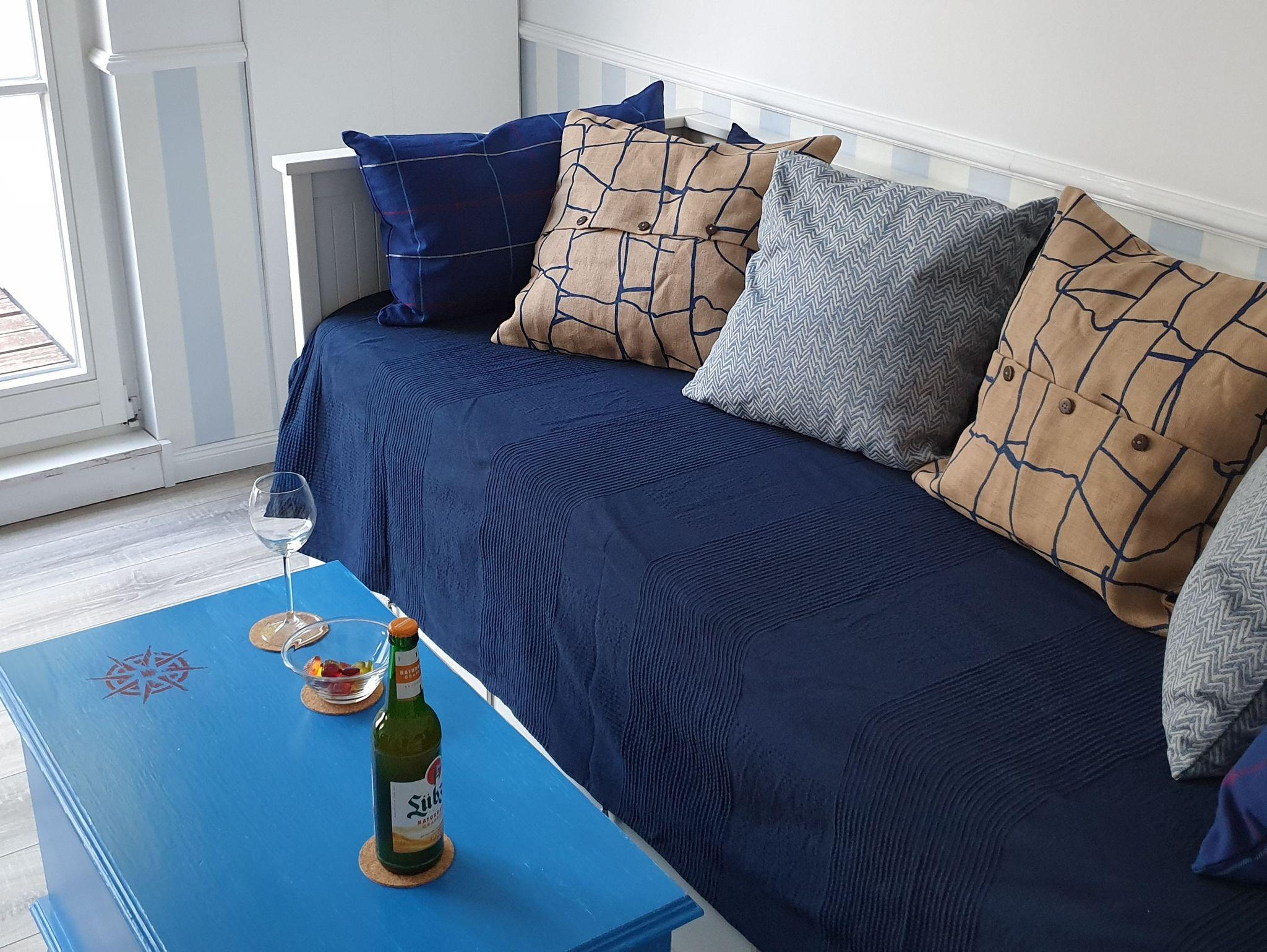 Sie erwartet eine geschmackvolle, maritime Einrichtung und eine Ausstattung, die kaum Wünsche offen lässt. Ein heller Wohnbereich mit Tagesbett/-Sofa und großem Essbereich.