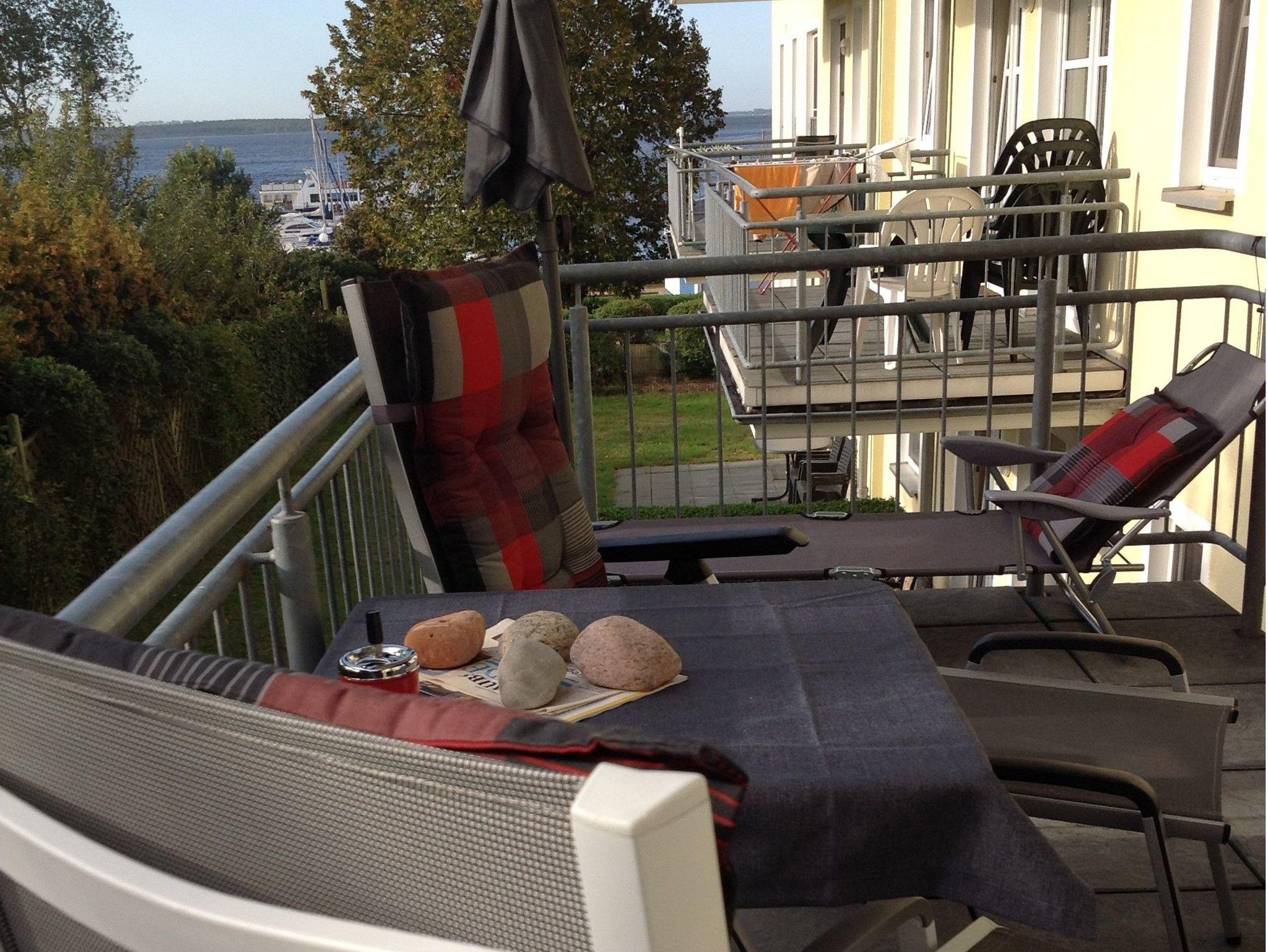 Auf dem Balkon genießen Sie bis Nachmittag die Sonne und den Blick Richtung Südost auf den Schiffsanleger am Haff. Unsere Wohnung ist eine Nichtraucherwohnung. Wobei auf dem Balkon ein Aschenbecher für Alle, die ohne Rauchen keinen Urlaub genießen können, zur Verfügung steht.
