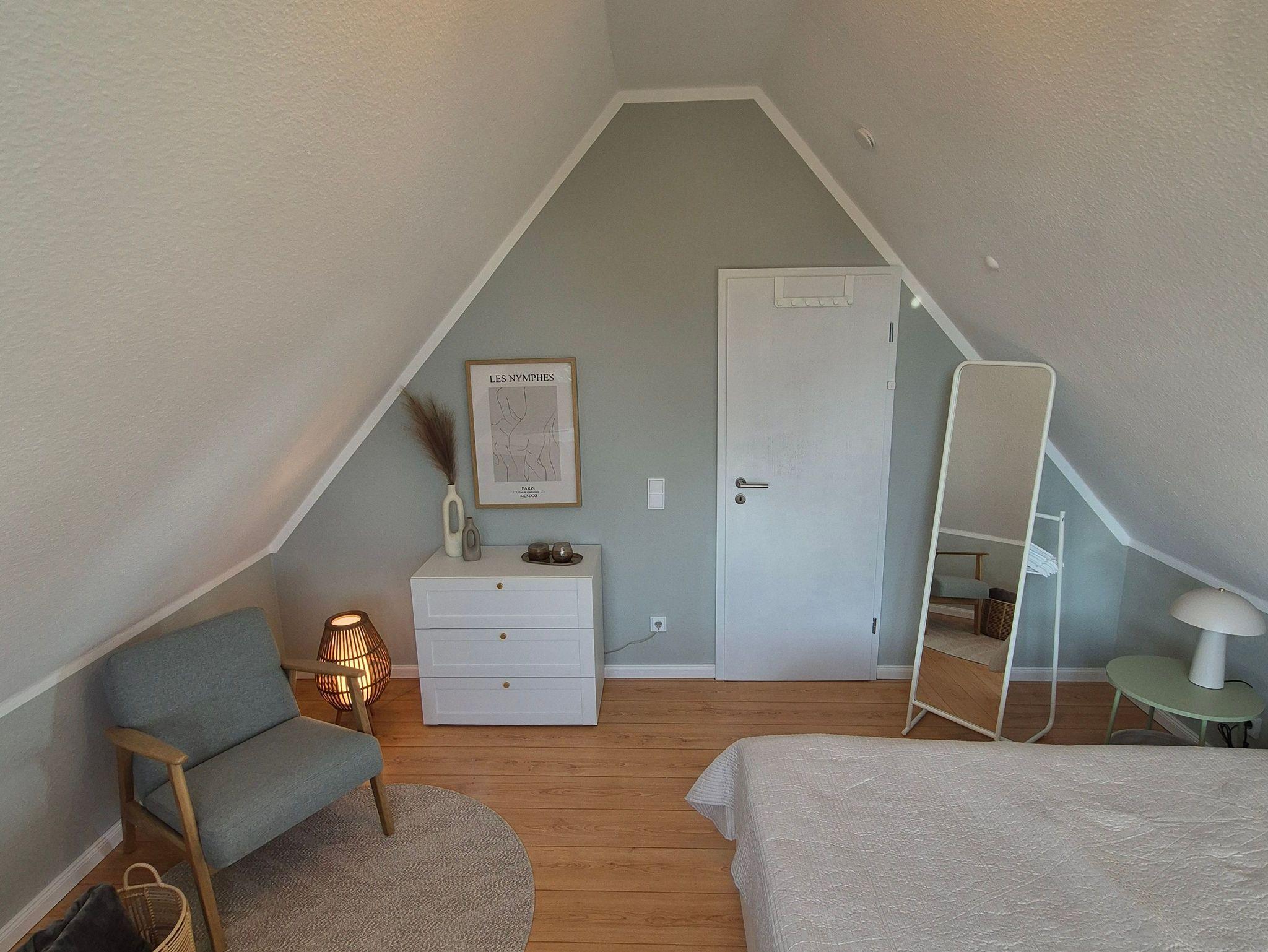 Im geräumigen, durch eine Wendeltreppe erreichbaren Giebelzimmer befindet sich ein Doppelbett (160 x 200 cm), eine gemütliche Leseecke sowie ein Schreibtisch und Smart-Bildschirm, der sich auch für Homeoffice und Workation bestens eignet.