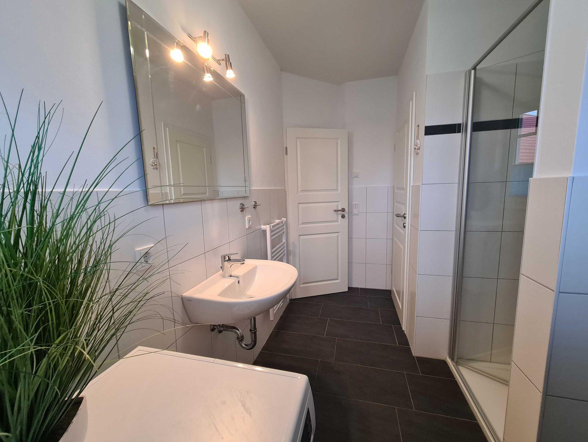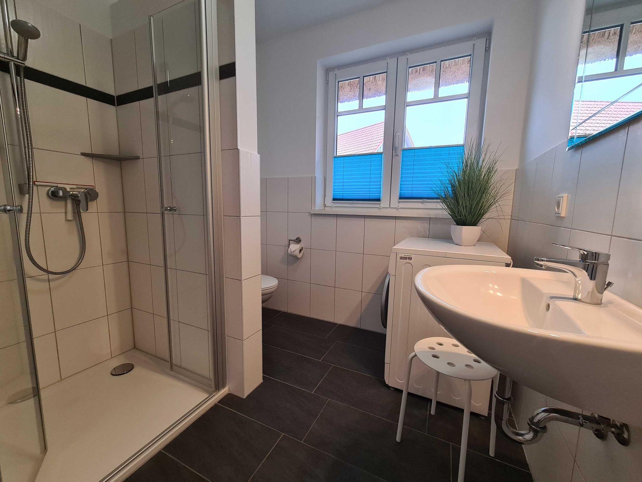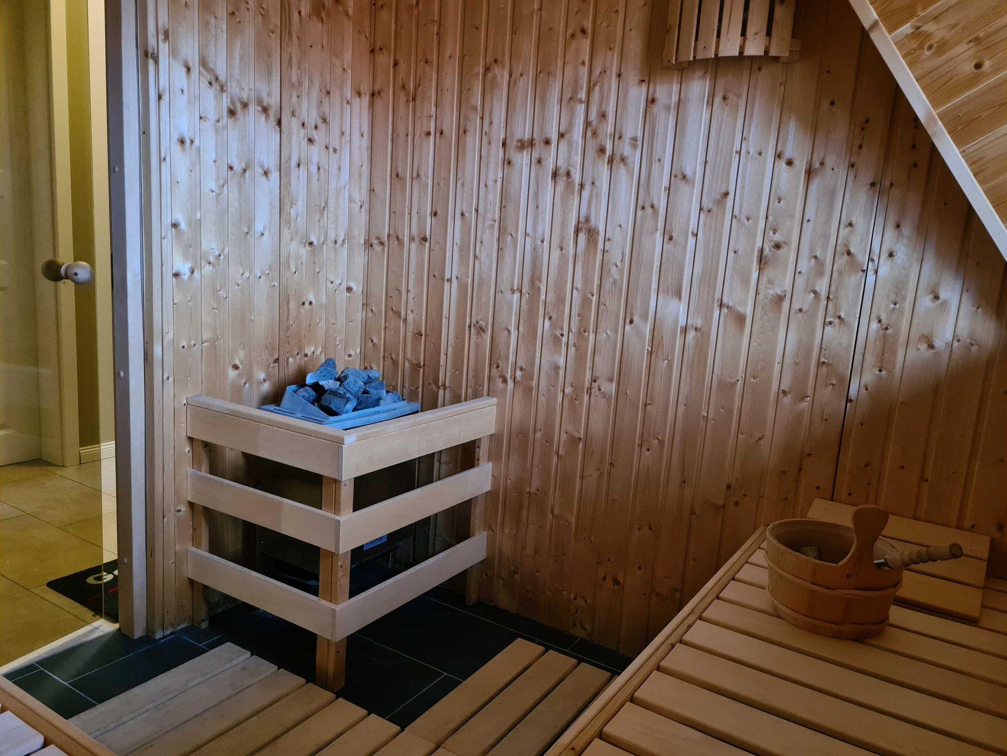 Großzügiges Badezimmer mit ebenerdiger großer Dusche und WC. Sauna mit Fenster.