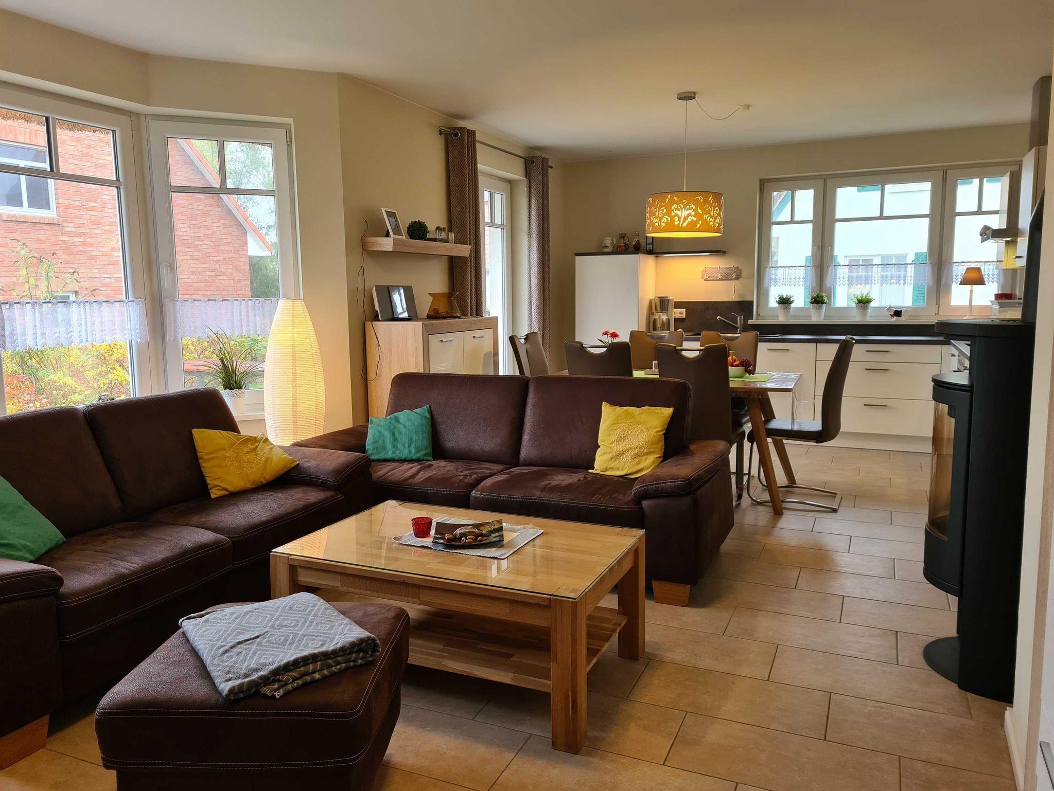 Erdgeschoss: komfortabler Wohnbereich mit Kamin, Einbauküche und Sofas sowie 1 Schlafzimmer, 1x Dusche/ WC.