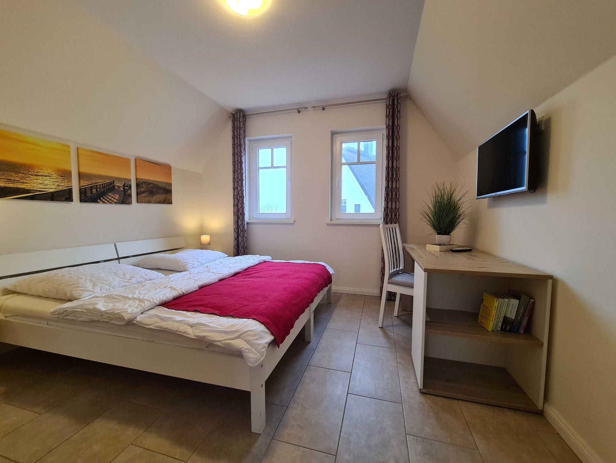 Schlafzimmer 1 mit Doppelbett (1,60 x 2m) und TV. Duschbad/WC und Waschmaschine.