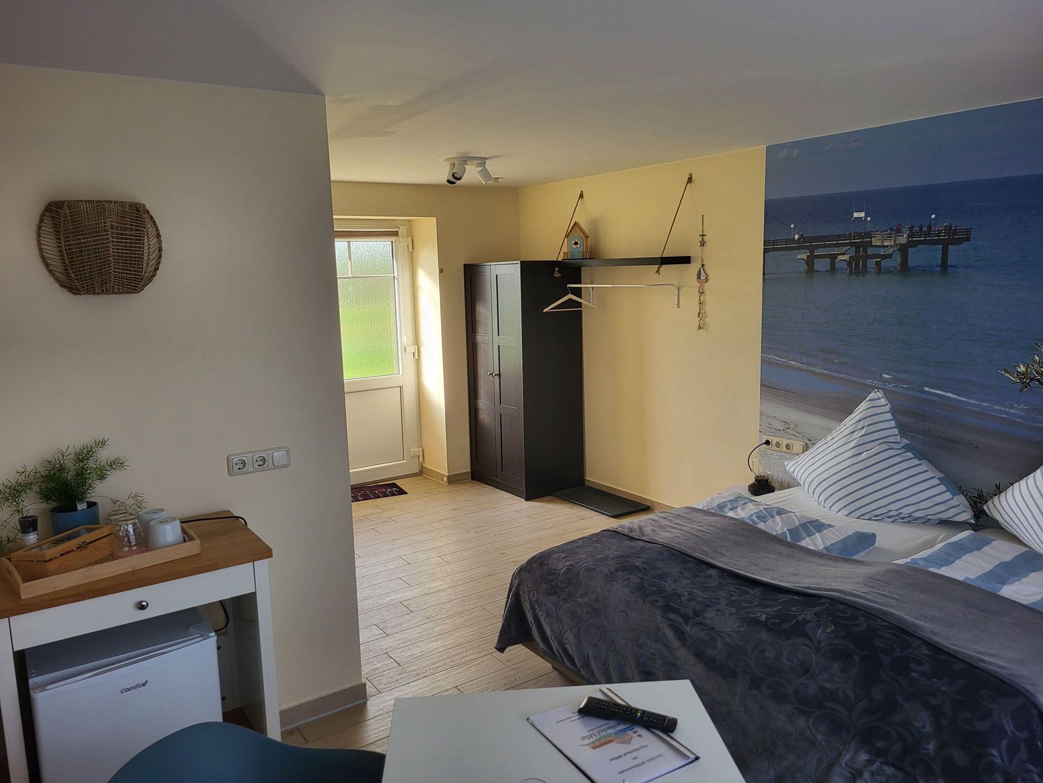 Das Doppelzimmer verfügt über ein Boxspringbett, das wahlweise als Doppelbett oder zwei Einzelbetten gestellt werden kann. Es gibt ein Duschbad/WC und ein kleines Küchenregal mit Wasserkocher, Minikühlschrank und Geschirr.