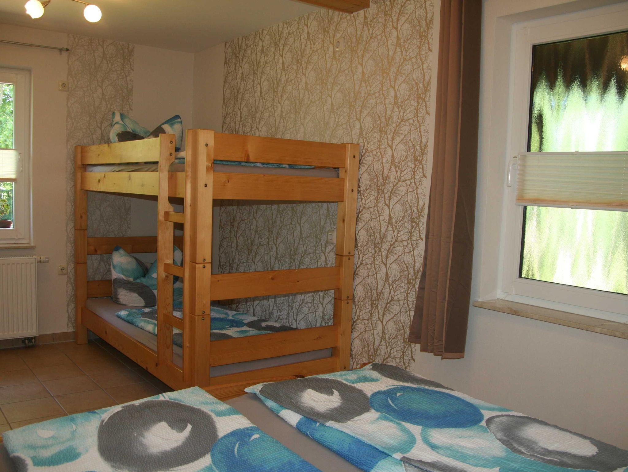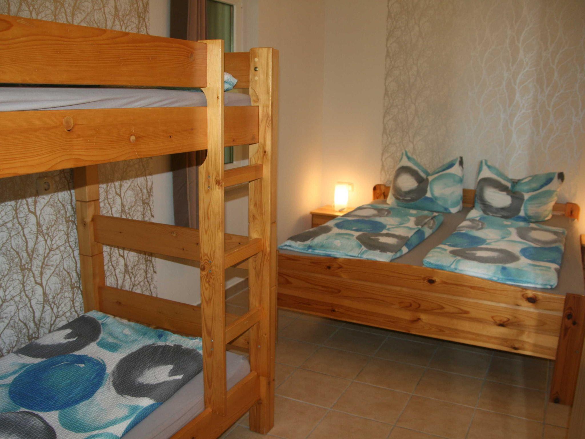 1 Schlafraum mit Doppelbett und Etagenbett. Für ein Babybett ist Platz im Schlafzimmer. Duschbad/ WC.