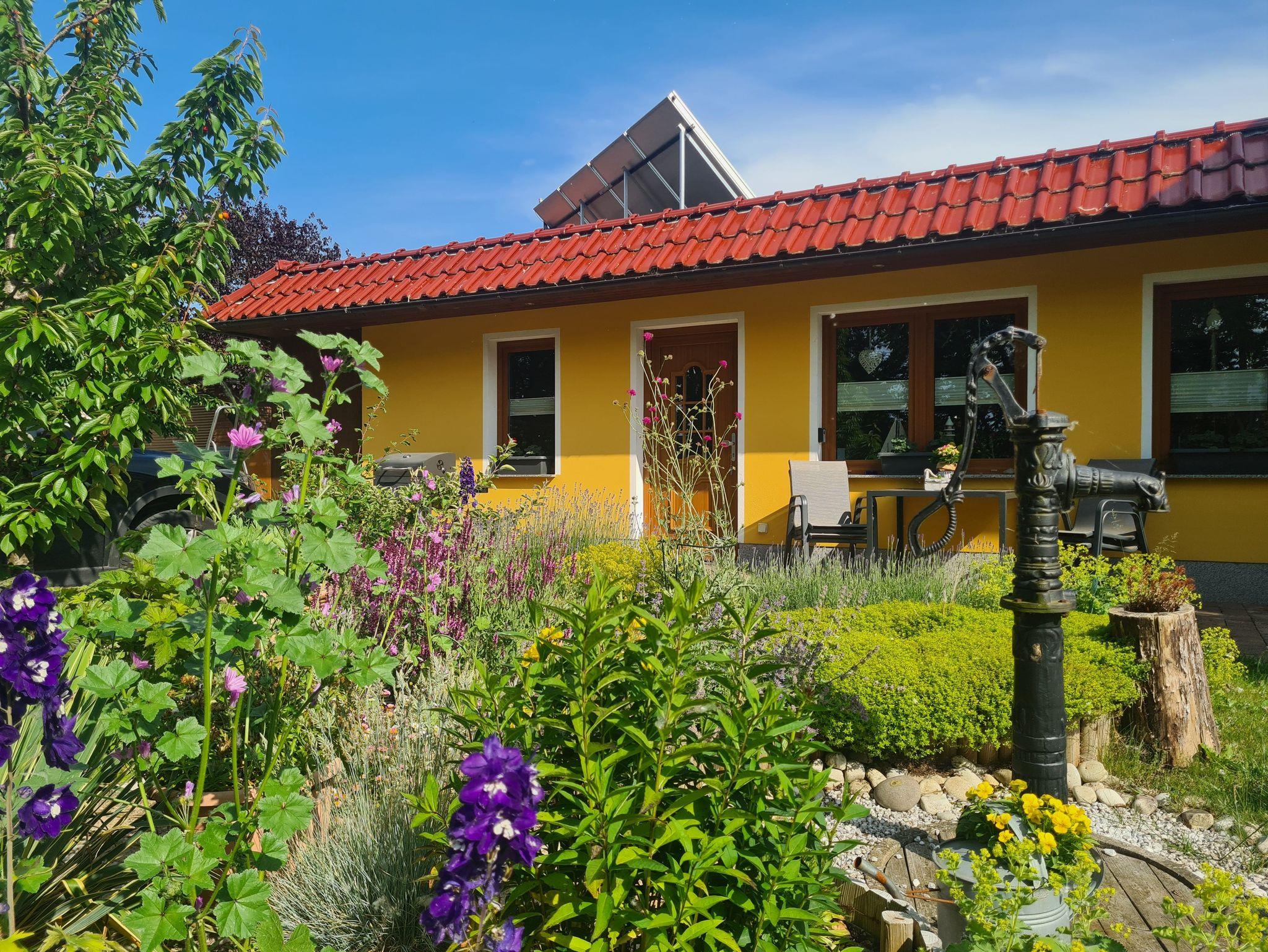 2-Raum-Gartenbungalow für 2-4 Personen, ebenerdig, rollstuhlgeeignet, Nichtraucher, Fußbodenheizung. Auf dem Grundstück des Wohnhauses der Gastgeberfamilie. Urlaub für Gäste mit Handicap: Bungalow komplett ebenerdig, schwellenlos, mit breiter Eingangstür und Schiebetüren innen. Stufenloser barrierefreier Zugang vom Parkplatz zum Bungalow mit Terrasse.