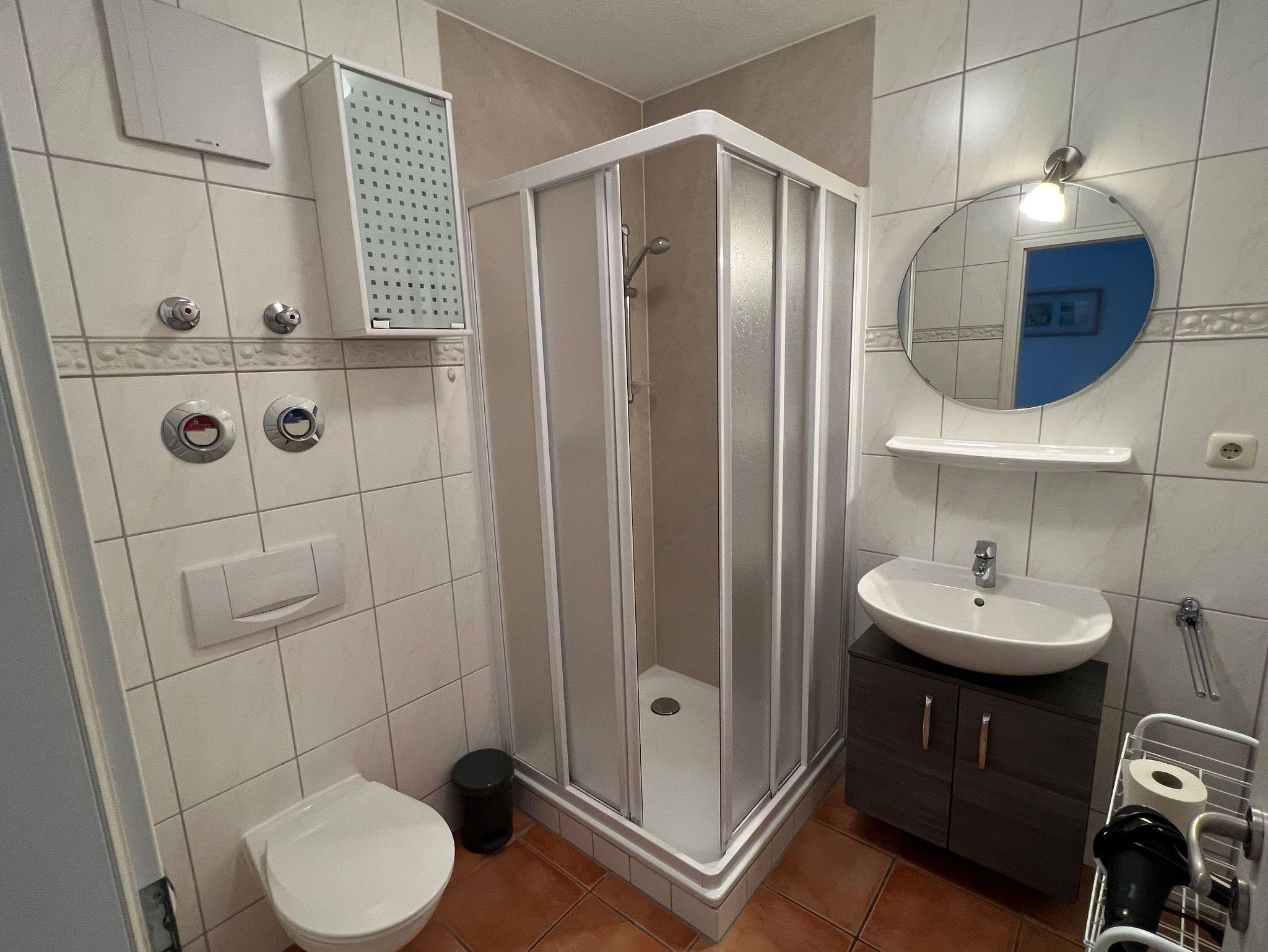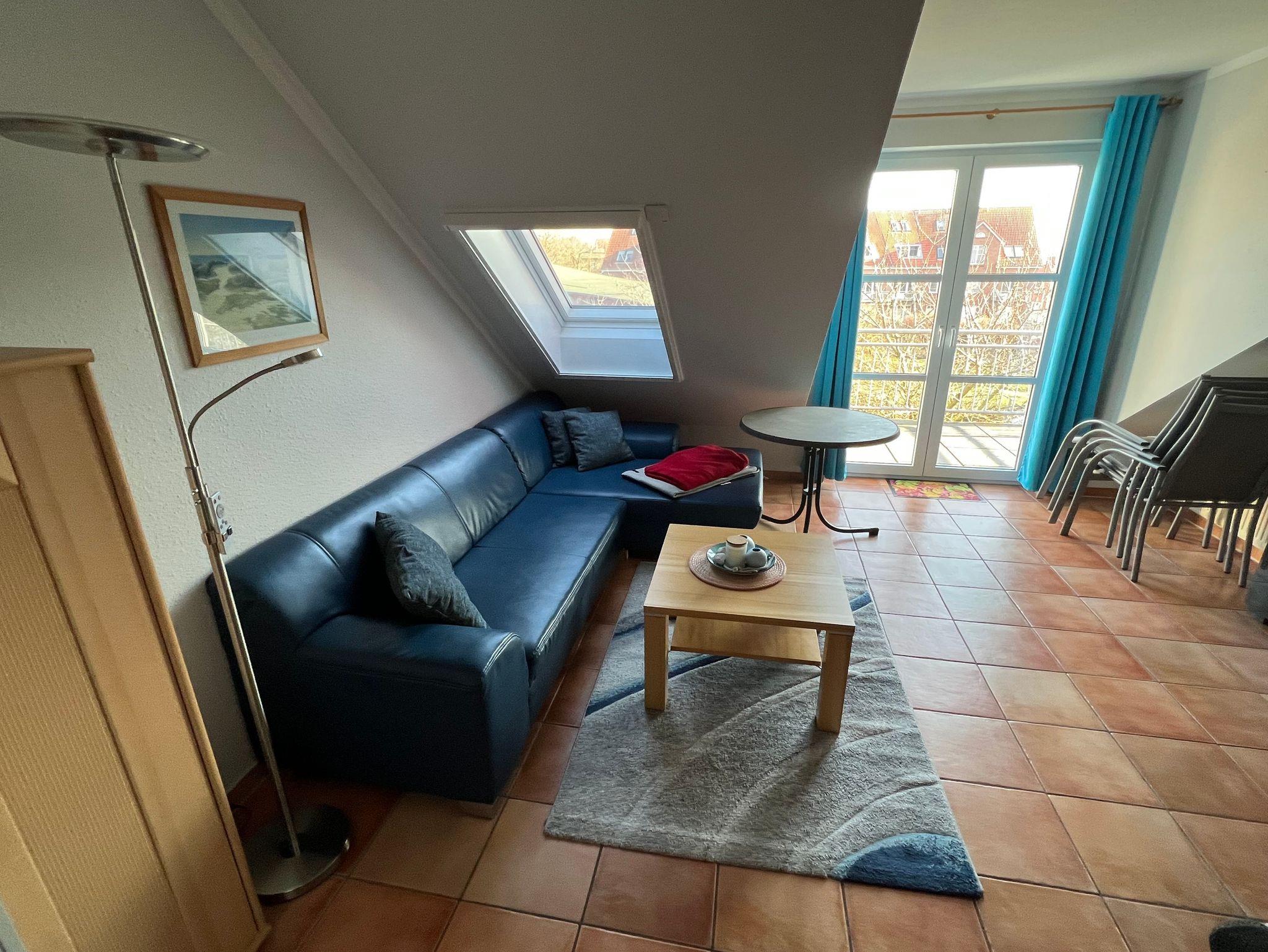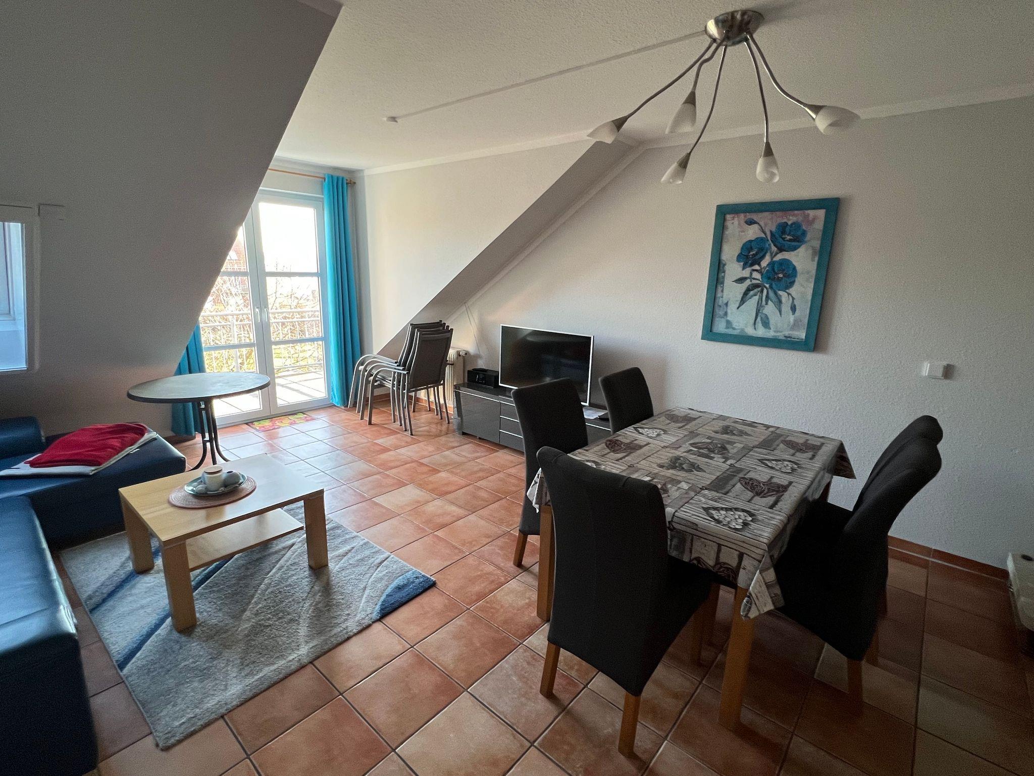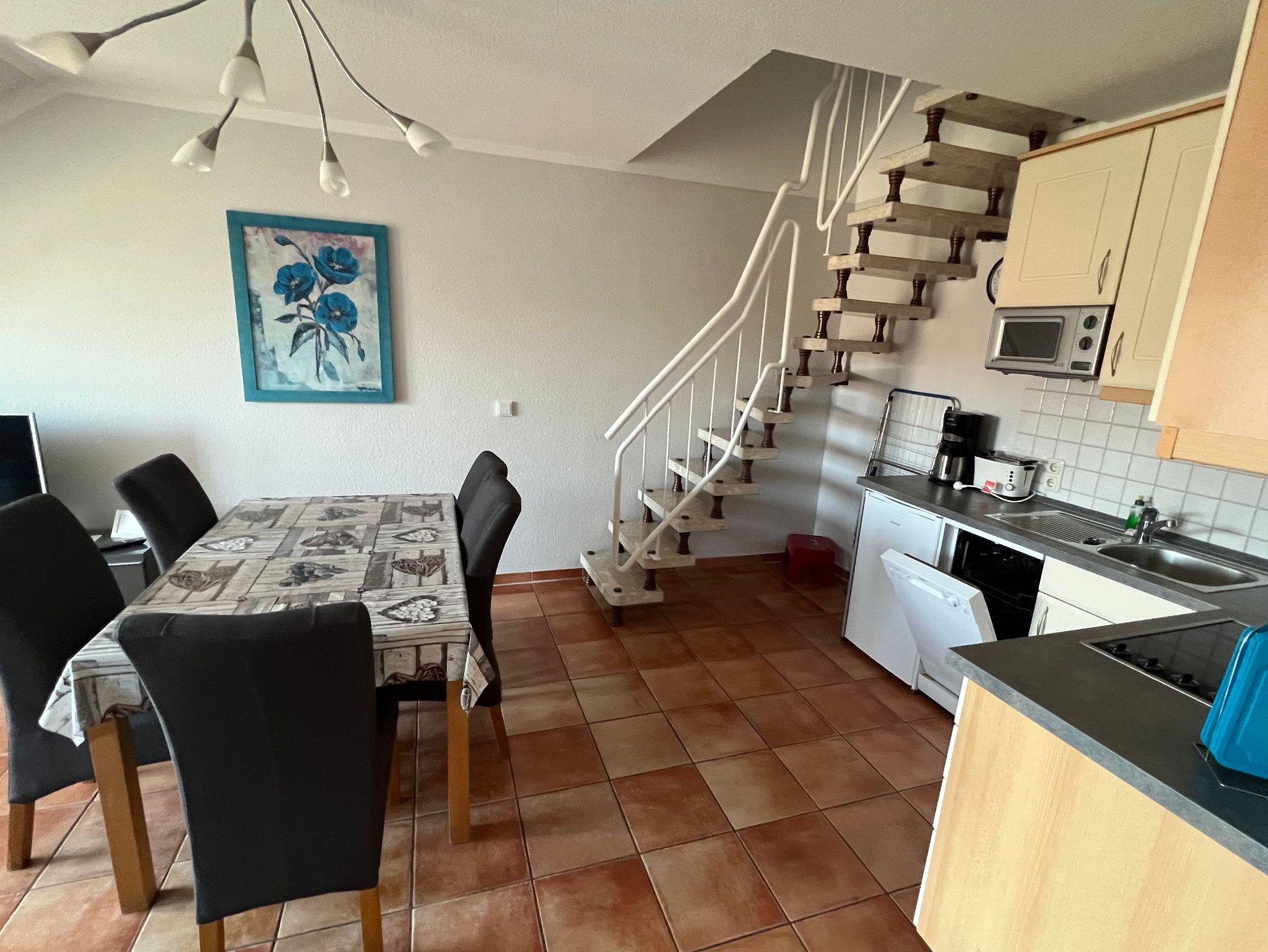 Unser Appartement befindet sich in der 2. Etage und geht über 2 Ebenen. Auf der ersten Ebene finden Sie den großzügigen Wohn- und Eßbereich mit Küchenzeile, gemütlicher Couchecke, Elternschlafzimmer und Badezimmer. Ein Balkon schließt an. Weiterhin verfügt die Wohnung über ein zweites Schlafzimmer im Dachgeschoss. Sie gelangen über eine kleine Treppe nach oben. Unsere Küchenzeile ist komplett ausgestattet mit allem was man benötigt. Ein Minibackofen ist vorhanden. Das Badezimmer hält Dusche und WC für Sie bereit. Die Dusche ist flach und ebenerdig. Alle Dachfenster sind mit Außenrolladen (elektrisch betrieben ) und Insektenschutz versehen.
